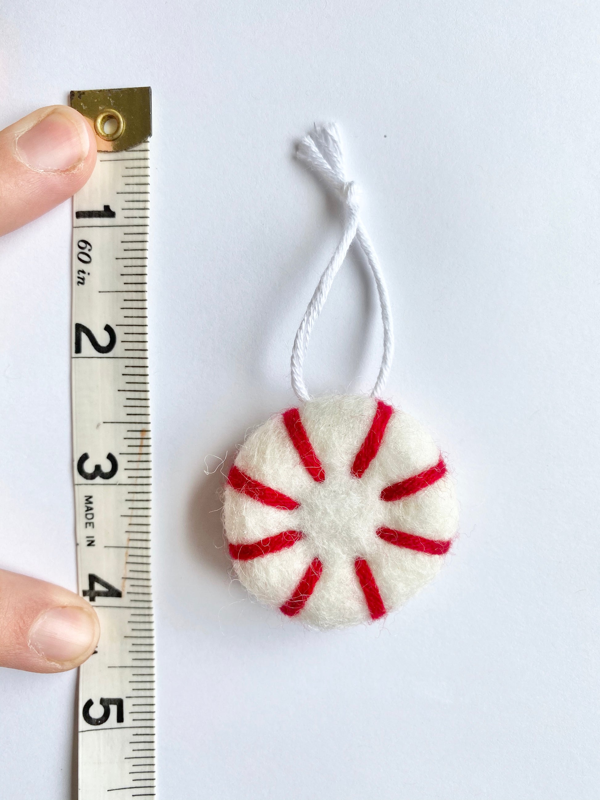 Peppermints measure about 4 centimeters each. Please note that each peppermint candy is hand felted and unique, varying ever so slightly from each other. Colors are white with red only.