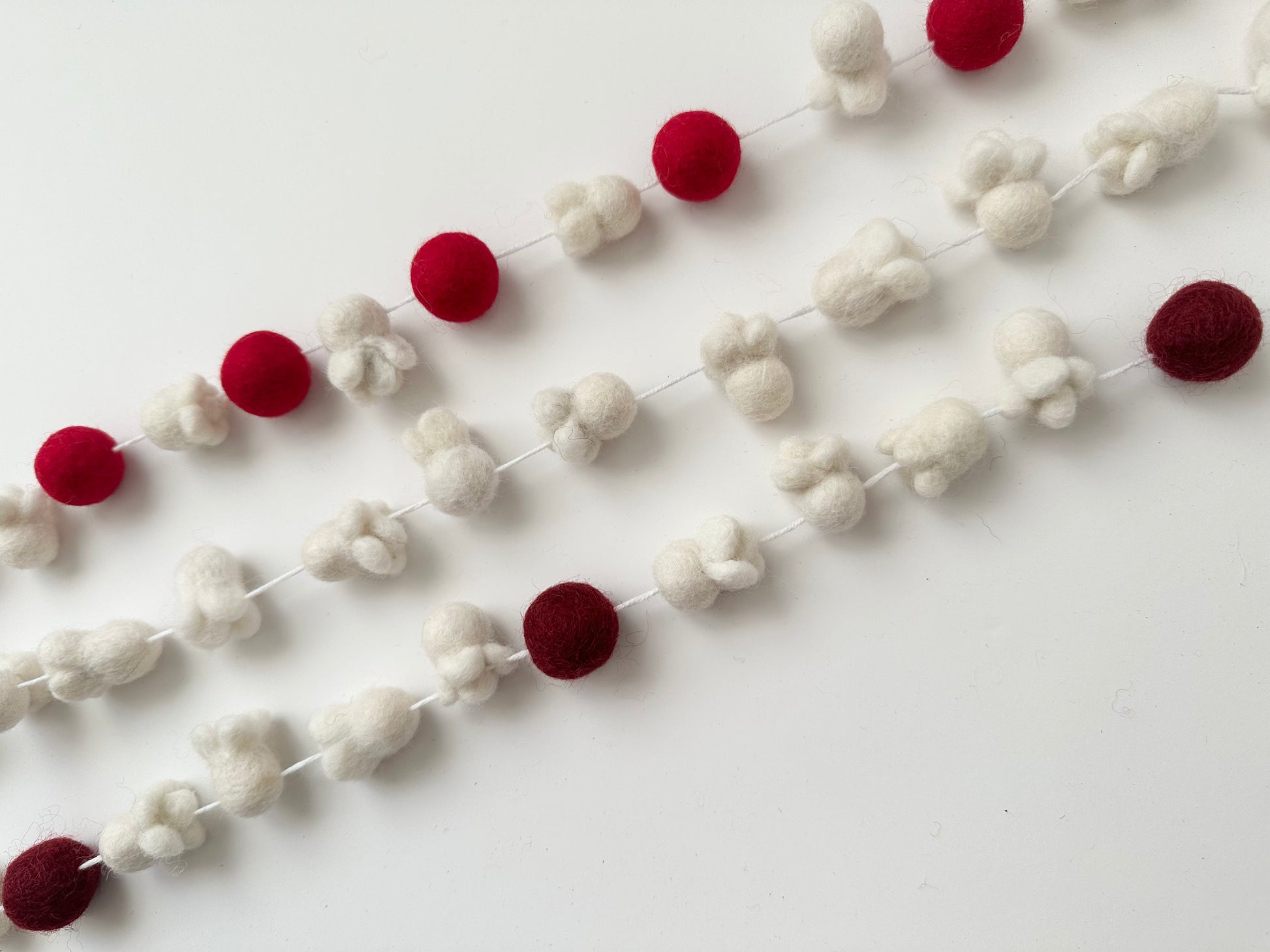 If you are choosing a style with felt balls, the color of the felt balls is customizable! Please name your color(s) in the Personalization section before placing in your cart. My felt ball color chart is found in the photos. Popcorn is not customizable, white is the only option.