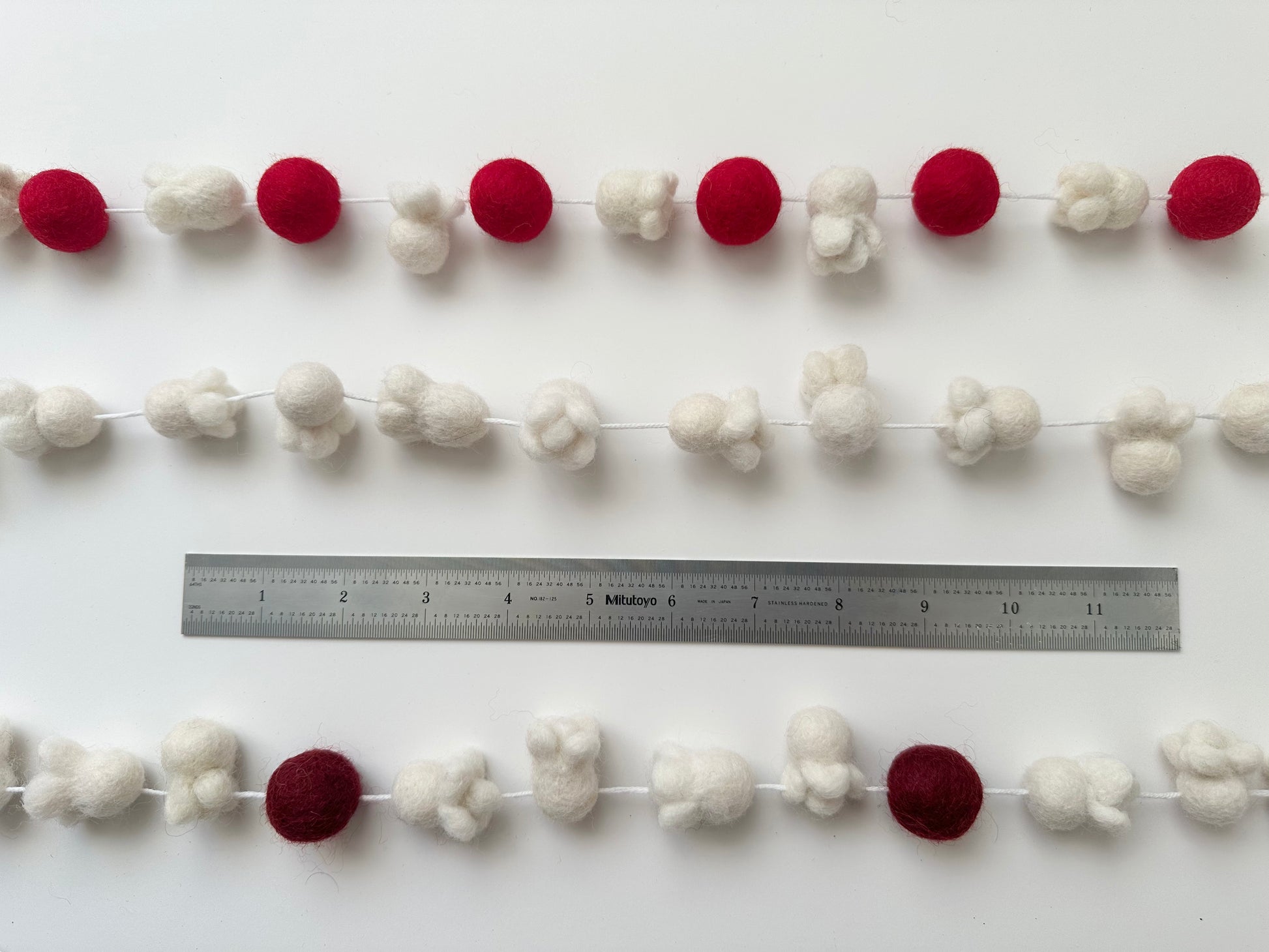 Made of wool felted "popcorn" that measures roughly 2.5cm. If you choose one of the two styles with felt balls, the felt balls are roughly the same size. Please allow slight variations in size due to their handmade nature.