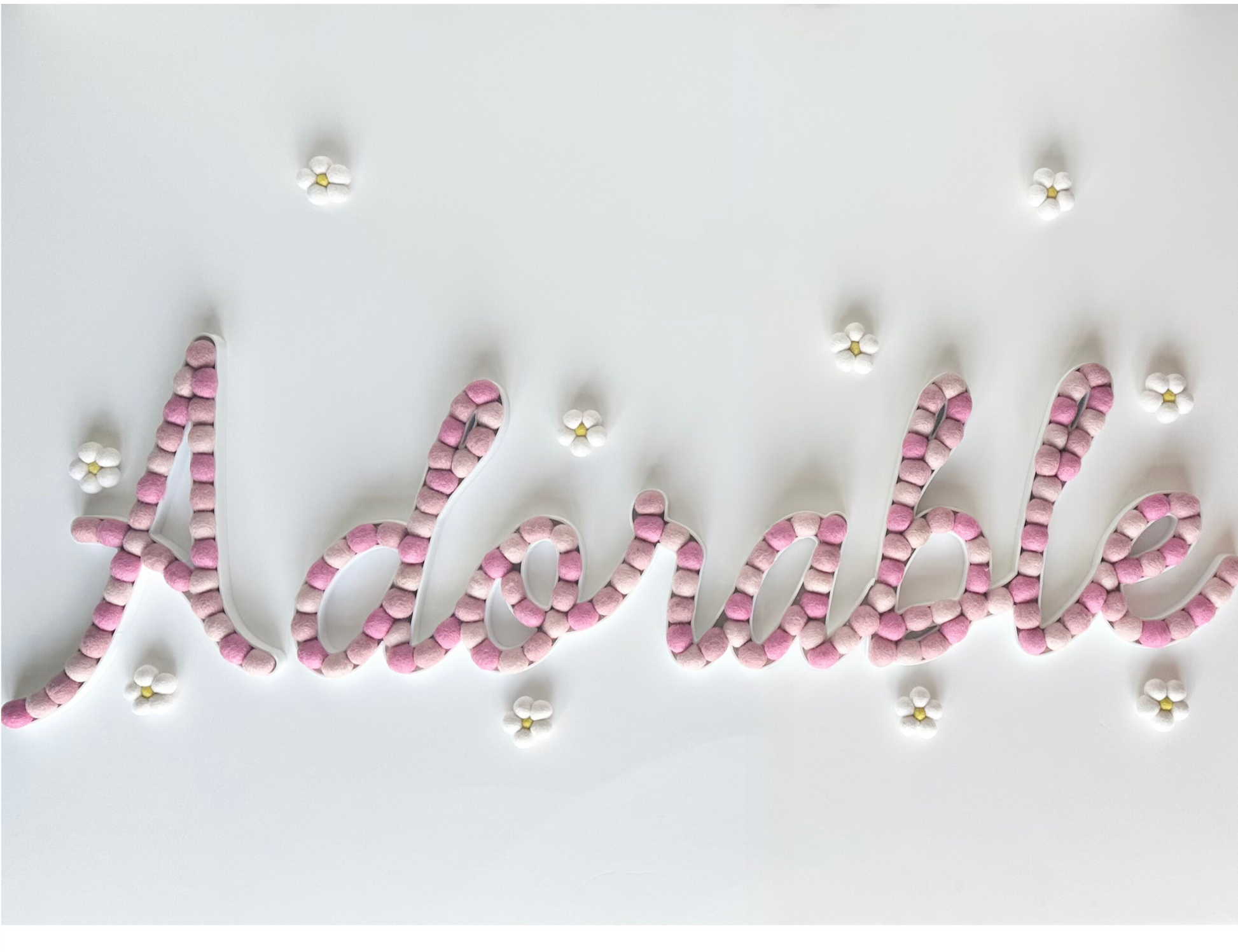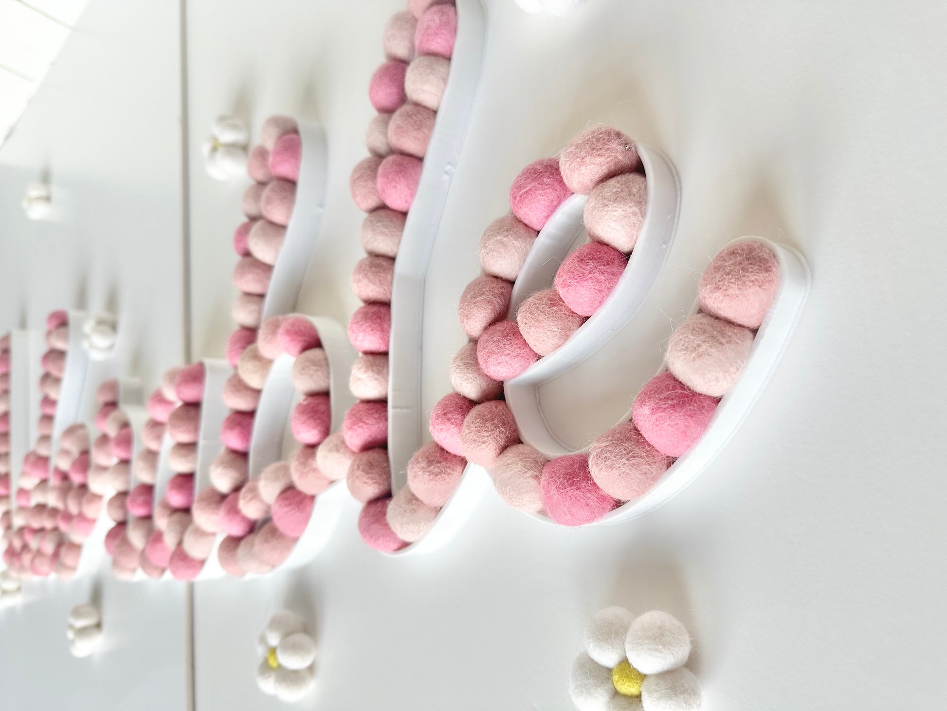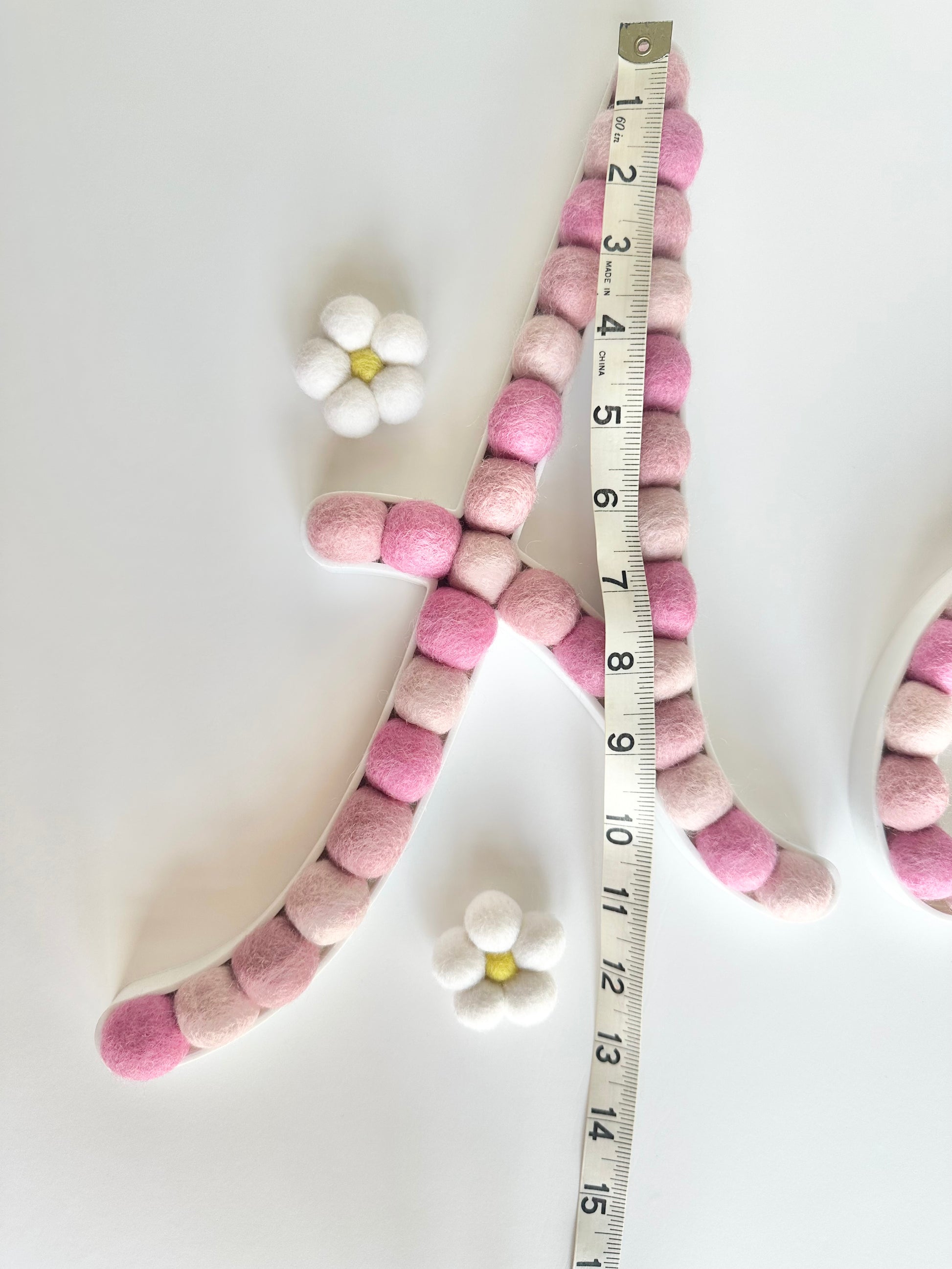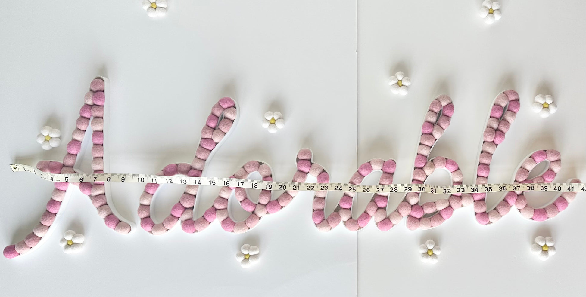 All letters are made from white PLA plastic and all felt balls are 2.5cm, though vary slightly because they are handmade. The white frame is just under 1 inch depth, so the felt balls peak out a little. This lets you see the felt balls from the side angle too! All letters will have a hole(s) in the back for level hanging. It will arrive in three pieces, the "A", the "dora" and "ble". each section will have two holes, so grab a level and some small nails and a hammer. They are easy to hang and light enough that they don't need a stud!