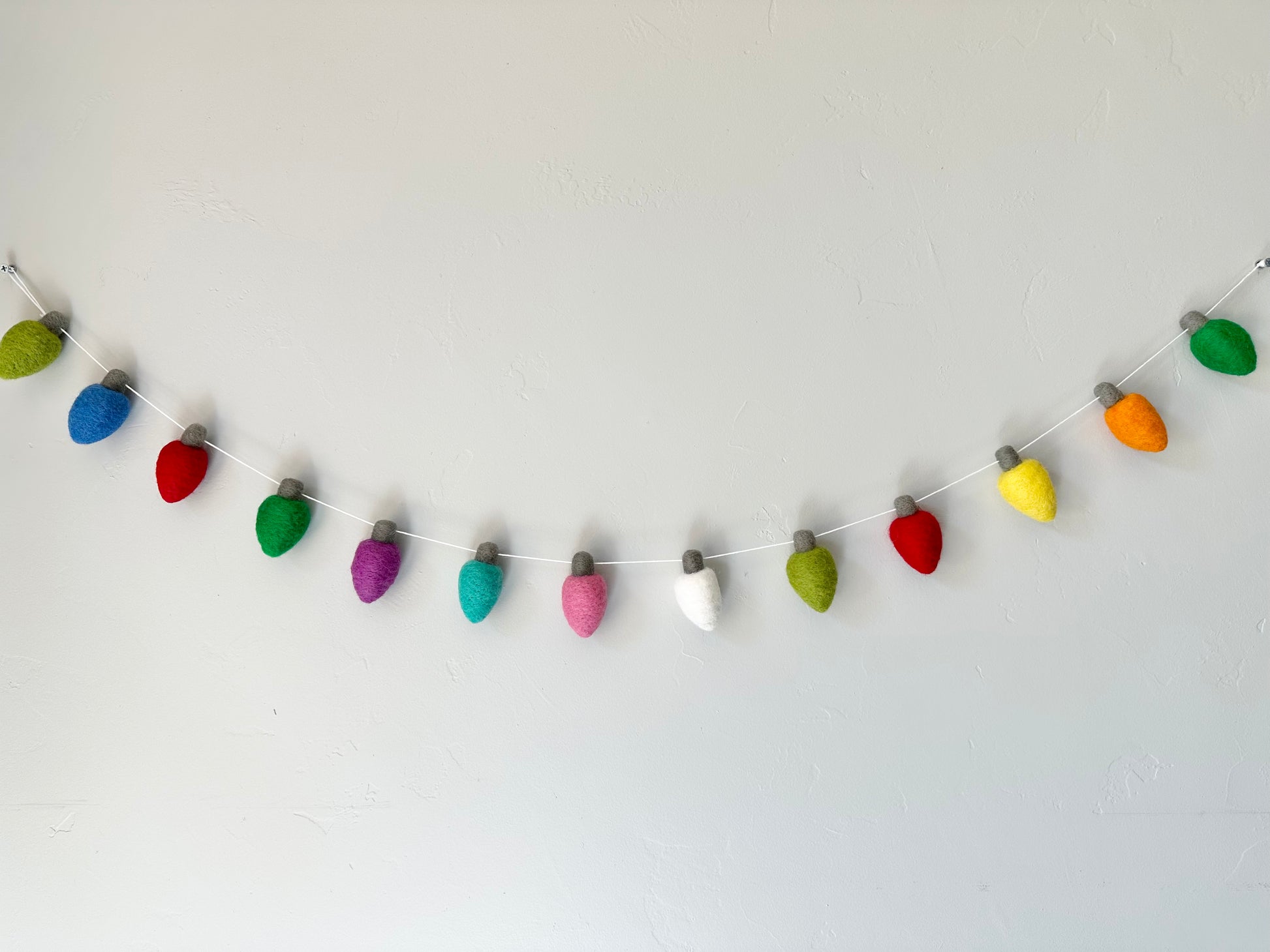 This customizable Wool Jamboree felted lightbulb garland is bright and perfect for so many uses at Christmastime! Holiday classroom decorations, a December Birthday Party banner, around your Christmas tree as trimmings! Can be hung on the wall, window, flowing over a table top or even around a bulletin board in a classroom!