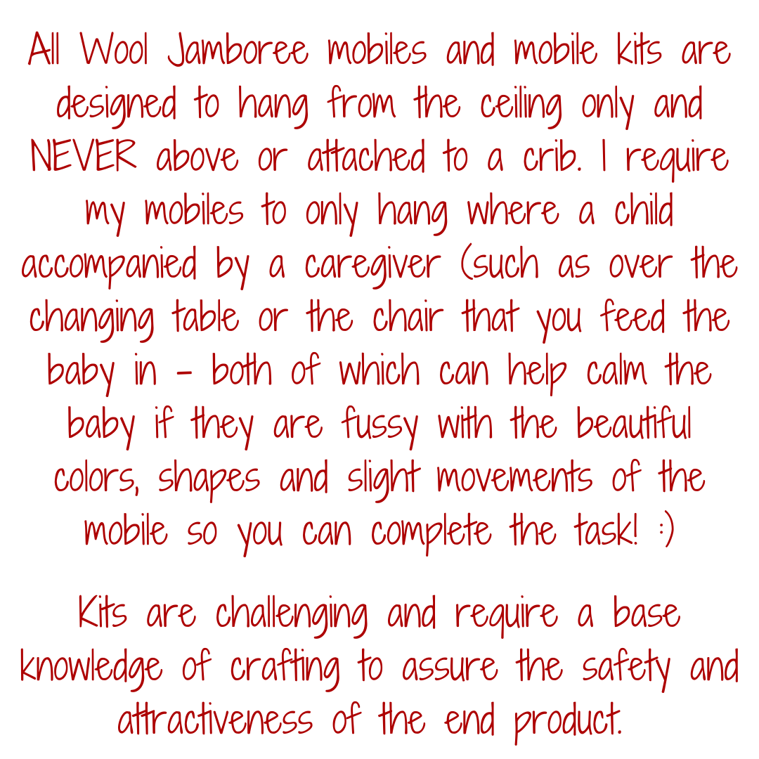 DISCLAIMER: As stated above, these mobiles are not to be hung from the side of the crib, that is why I offer a ceiling hook within the listing. The long strands pose a strangulation risk so I will not sell them to customers intending to hang the ceiling mobile from the crib. All Wool Jamboree mobile kits are designed to hang from the ceiling only and NEVER above a crib. I require my mobiles to only hang where a child is accompanied by a caregiver (such as over the changing table or the chair that you feed the baby in - both of which can help calm the baby if they are fussy with the beautiful colors, shapes and slight movements of the mobile so you can complete the task! :) This eliminates all risk of strangulation or choking because the baby is always with you in these locations. This is what I did for all three of my babies and it made changing cranky little ones so much easier!
