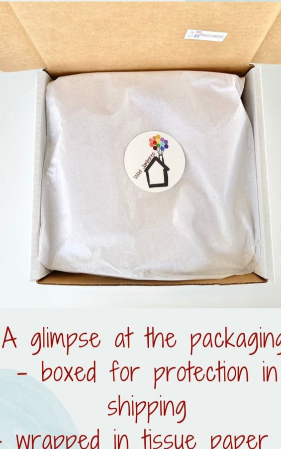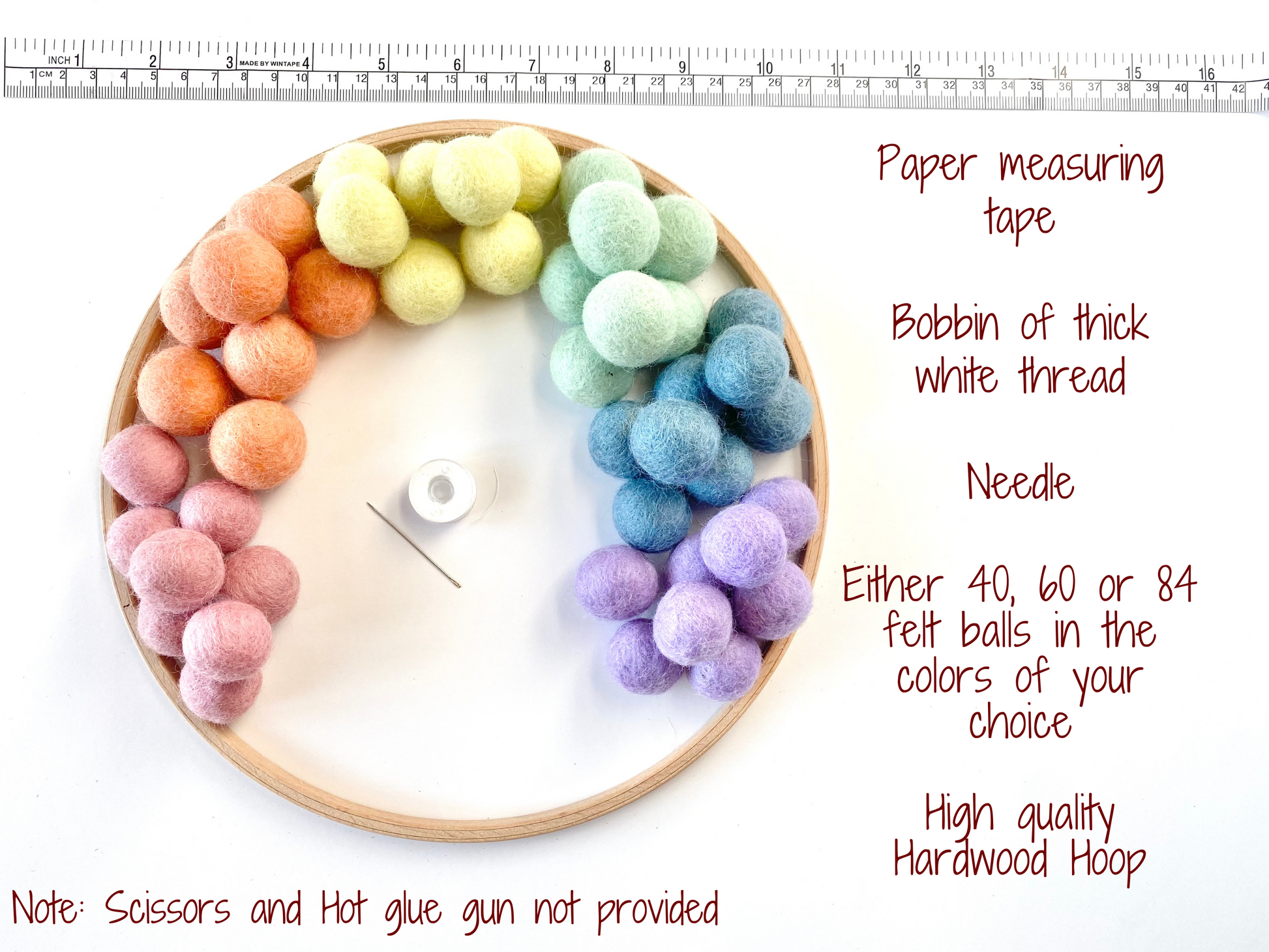 Dimensions to note: 2.5cm felt balls, 9in diameter hardwood hoop, way more thick thread than you could possibly need! Felt balls can be slid along the string to achieve the specific look you want, they stay where you place them. Mobiles are made to hang from a ceiling hook, which is an add on to this listing for your convenience. The 2.5 inch hook is a white rubber coated metal hook that screws easily into all drywall and plaster without the need of a stud.