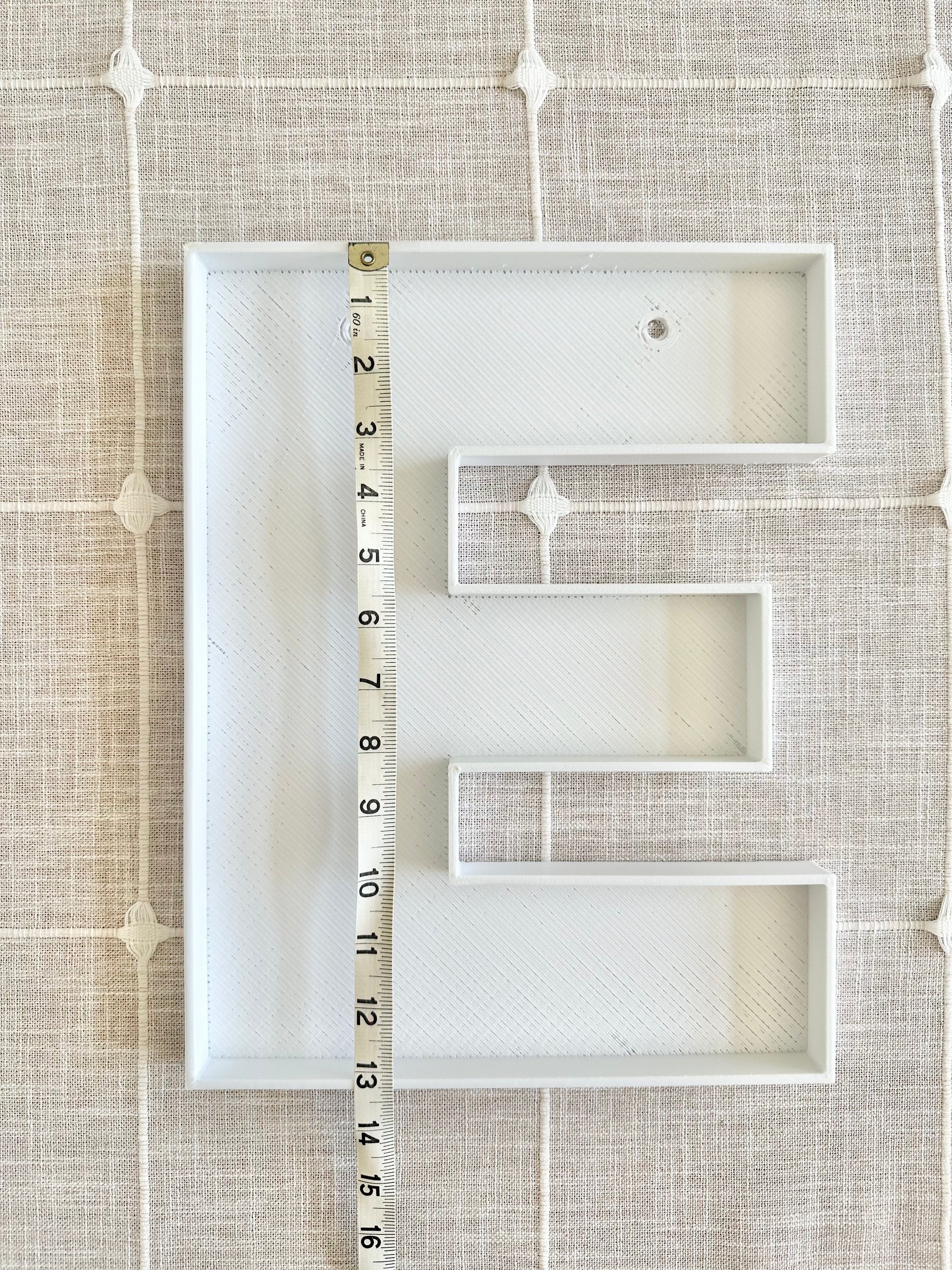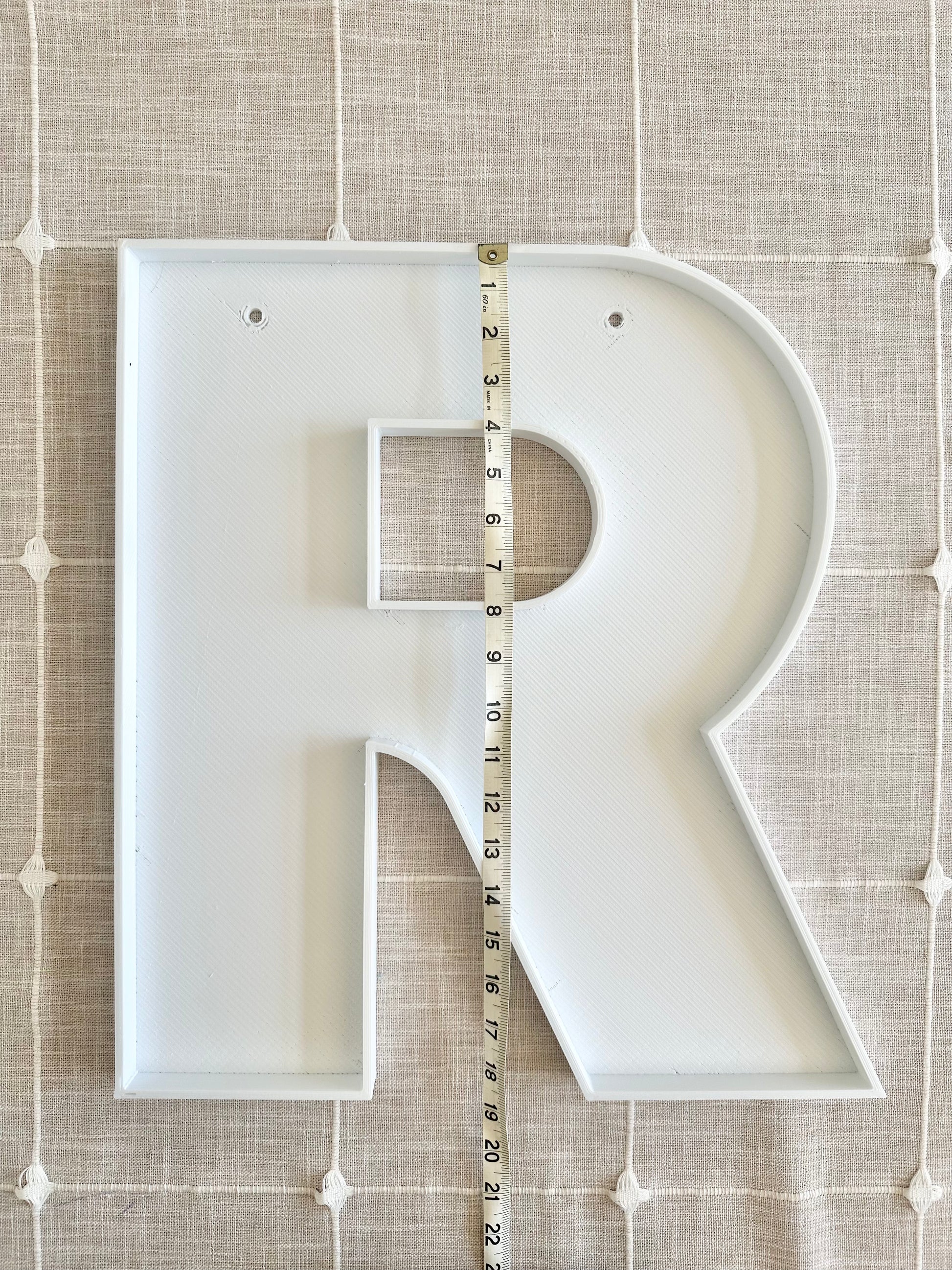 All letters are made from white PLA plastic. If you look at the listing photos, you might notice there are varying shades of white. If you order more than one letter/number, I will assure all of your order is in the same shade of white. We have more than one supplier for our 3D filament and they each have their own "white". All letters will have a hole(s) in the back for level hanging. Holes are completely hidden by what you are filling it in with. if you plan to have them as shelf sitters (only 8.5in size is recommended for standing shelf sitters, bigger sizes will have to rest against the wall if standing).