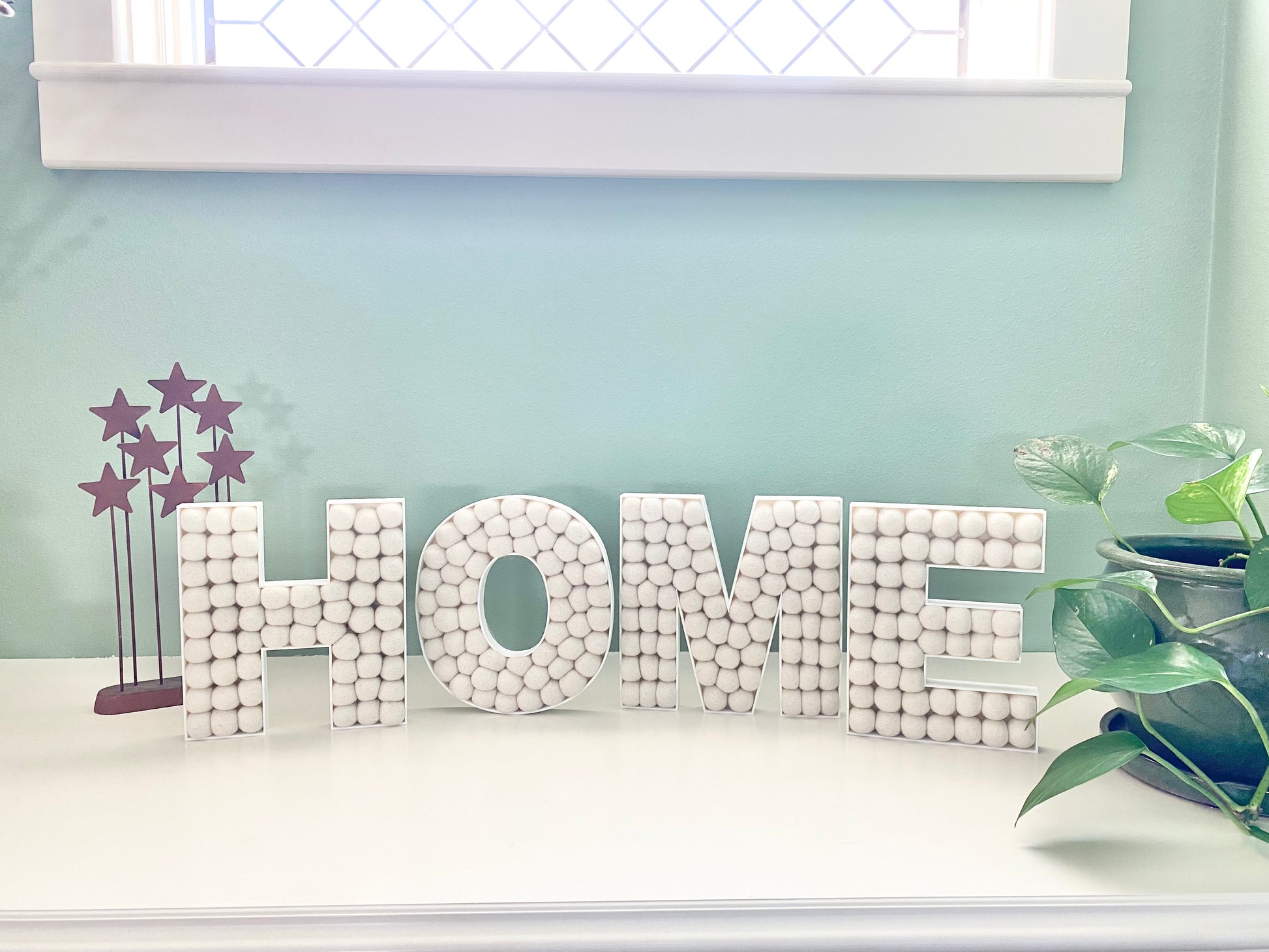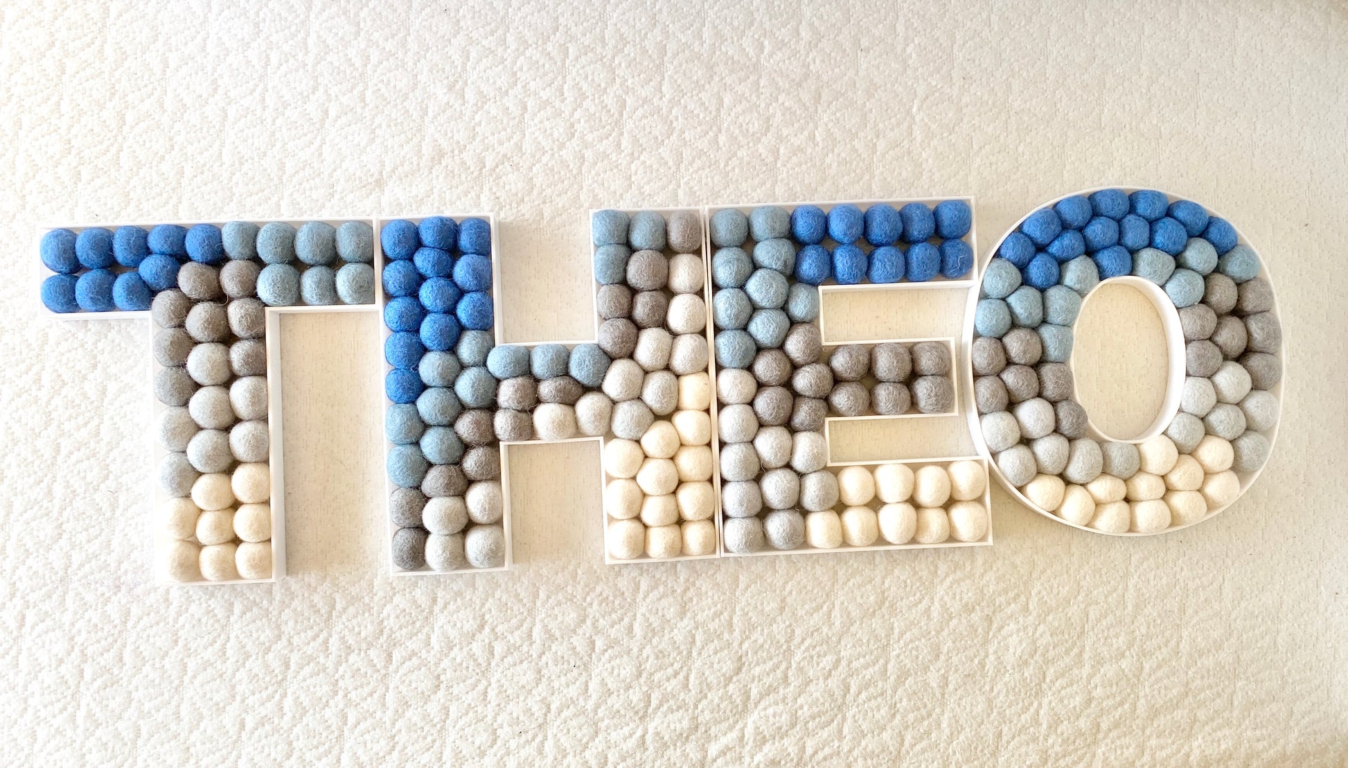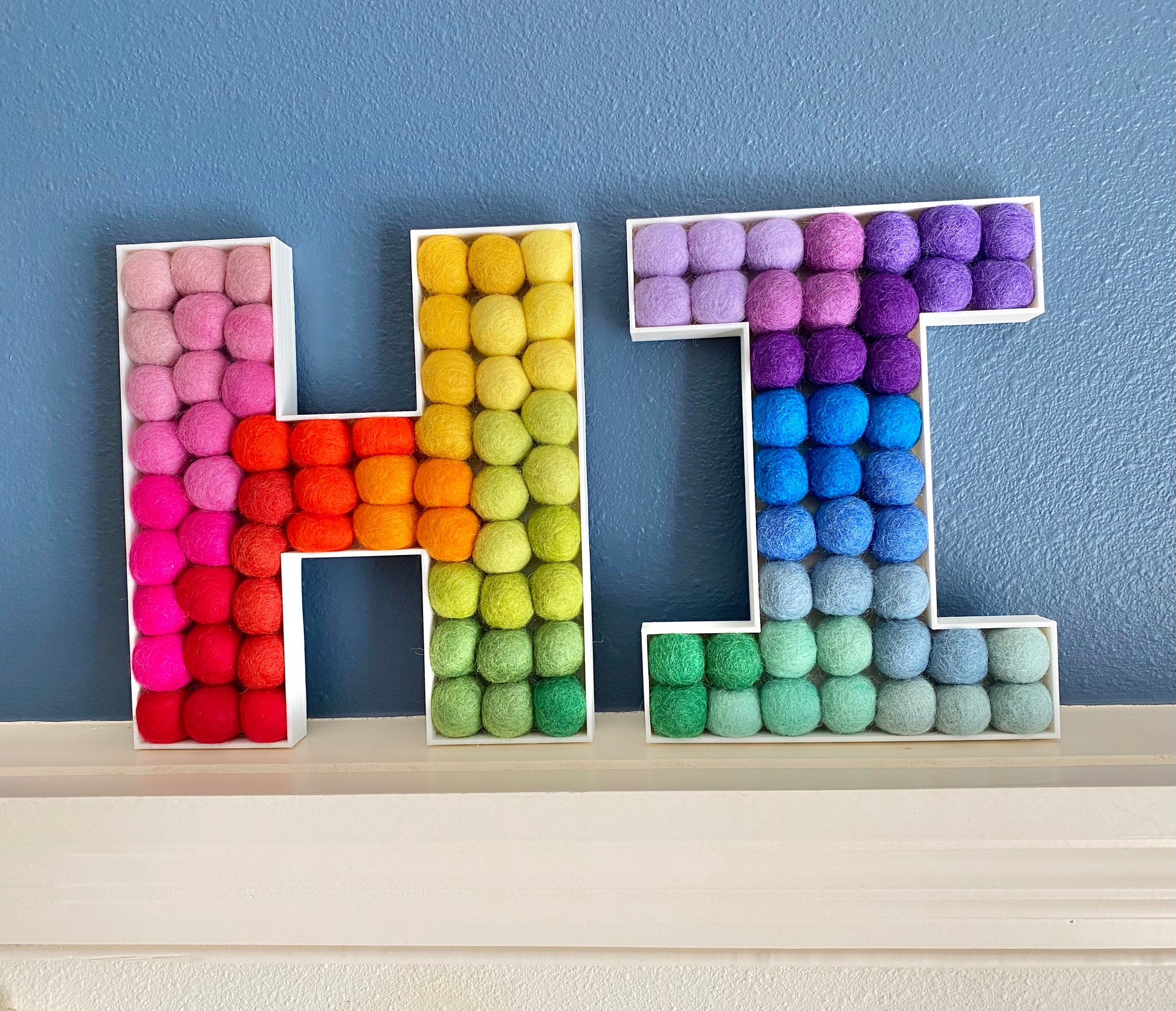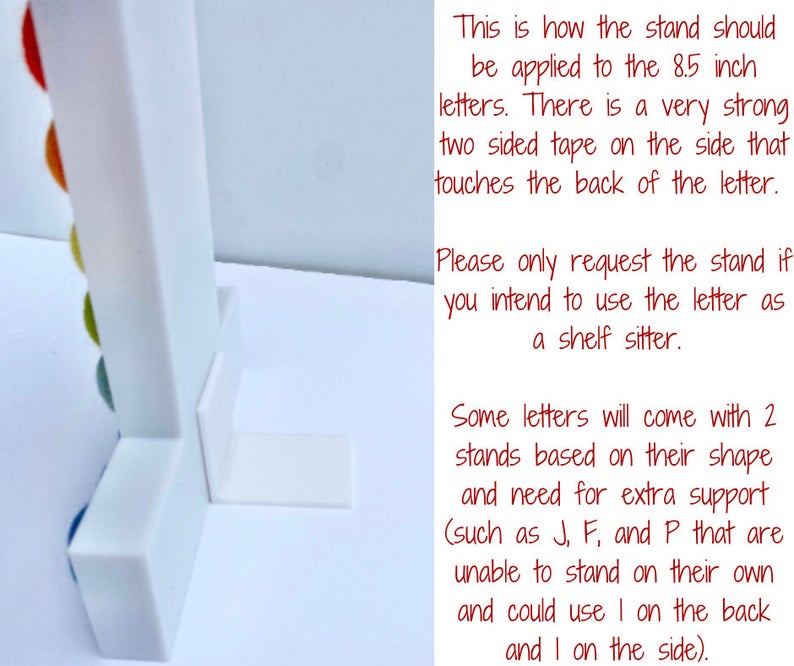 All letters are made from white PLA plastic and all felt balls are 2.5cm, though vary slightly because they are handmade. All sizes are 1 inch depth, so the felt balls peak out a little. This lets you see the felt balls from the side angle too! All letters will have a hole(s) in the back for level hanging. Holes are completely hidden if you plan to have them as shelf sitters (only 8.5in size is recommended for standing shelf sitters, bigger sizes will have to rest against the wall if standing).
