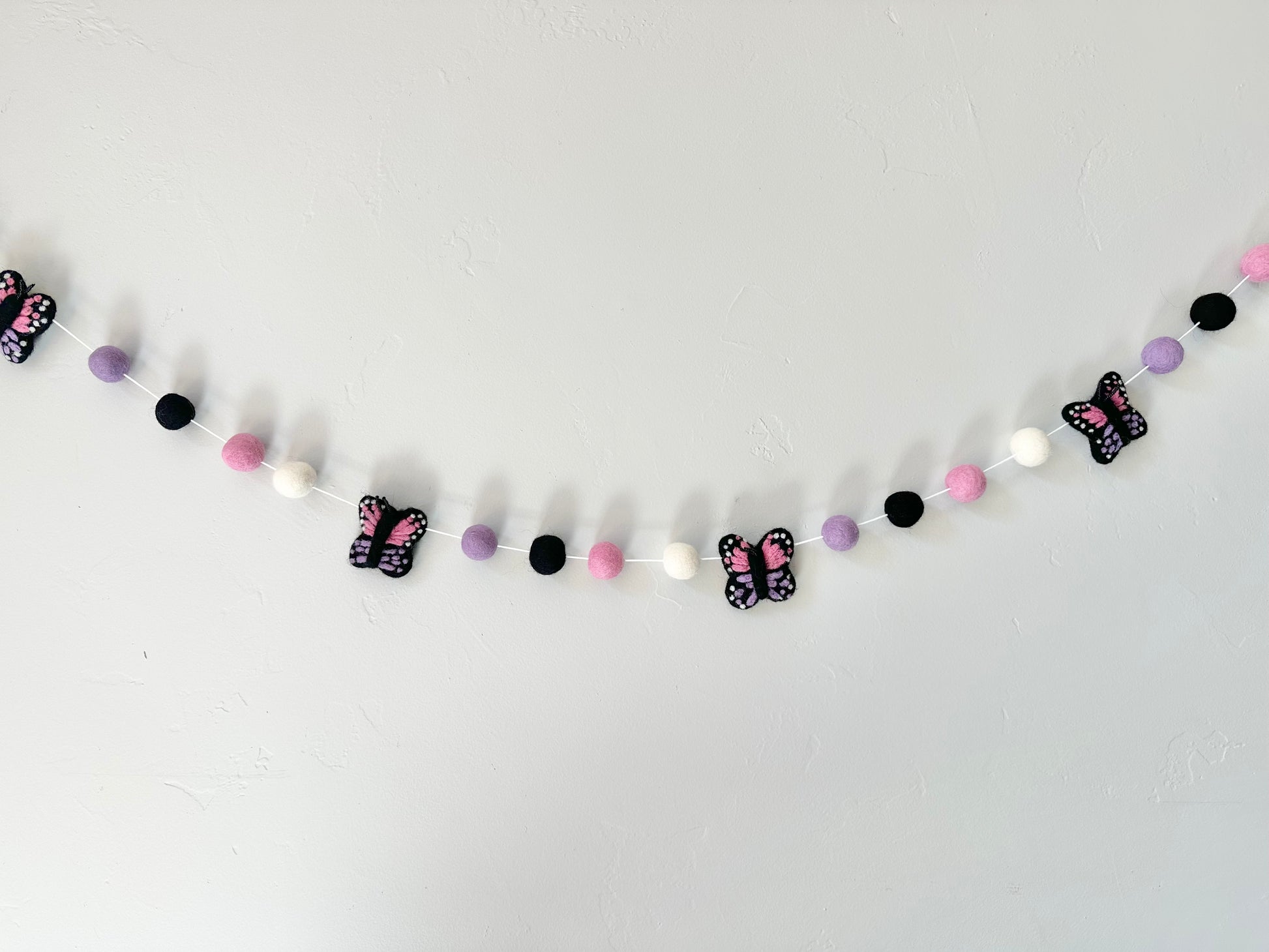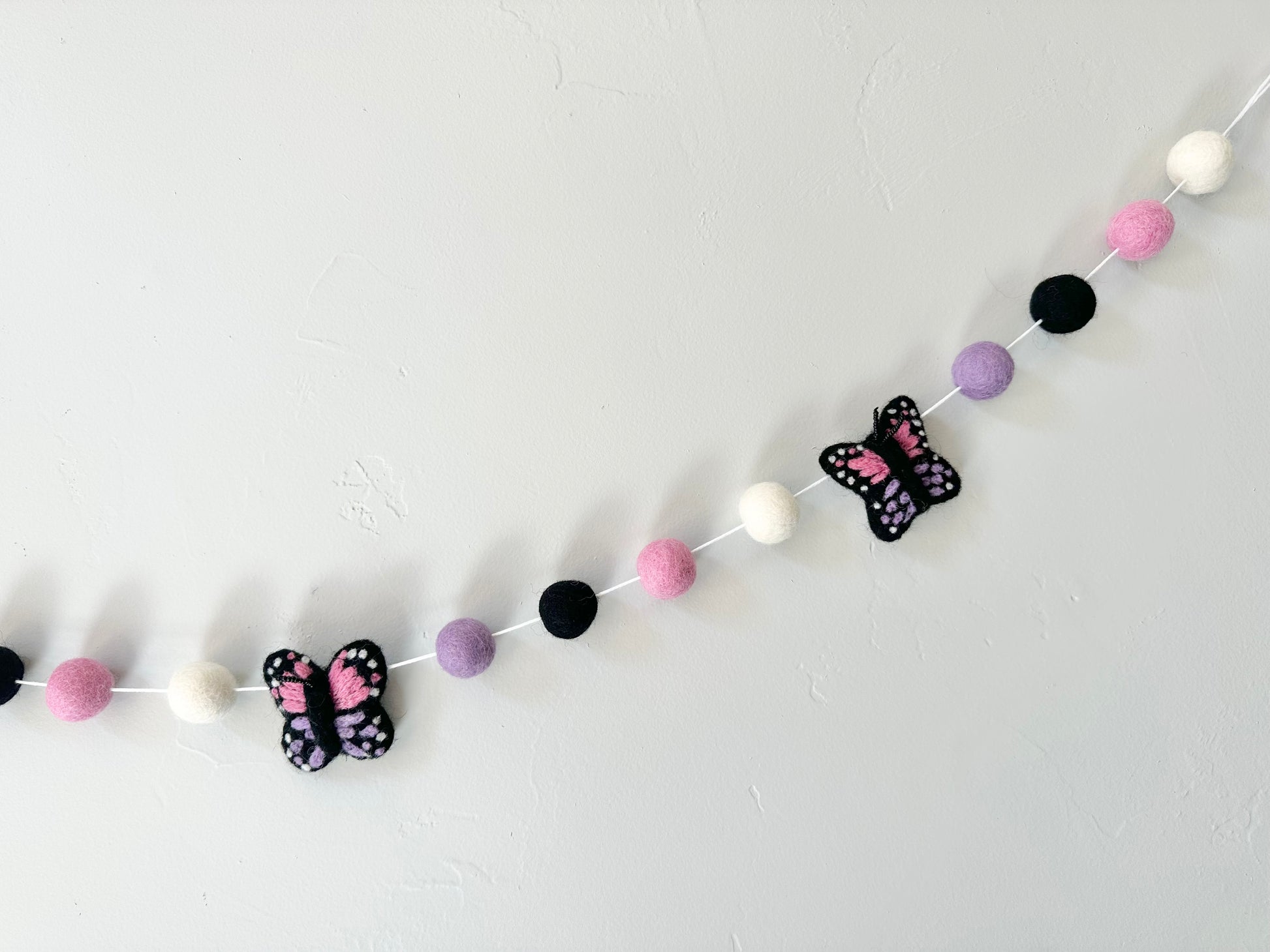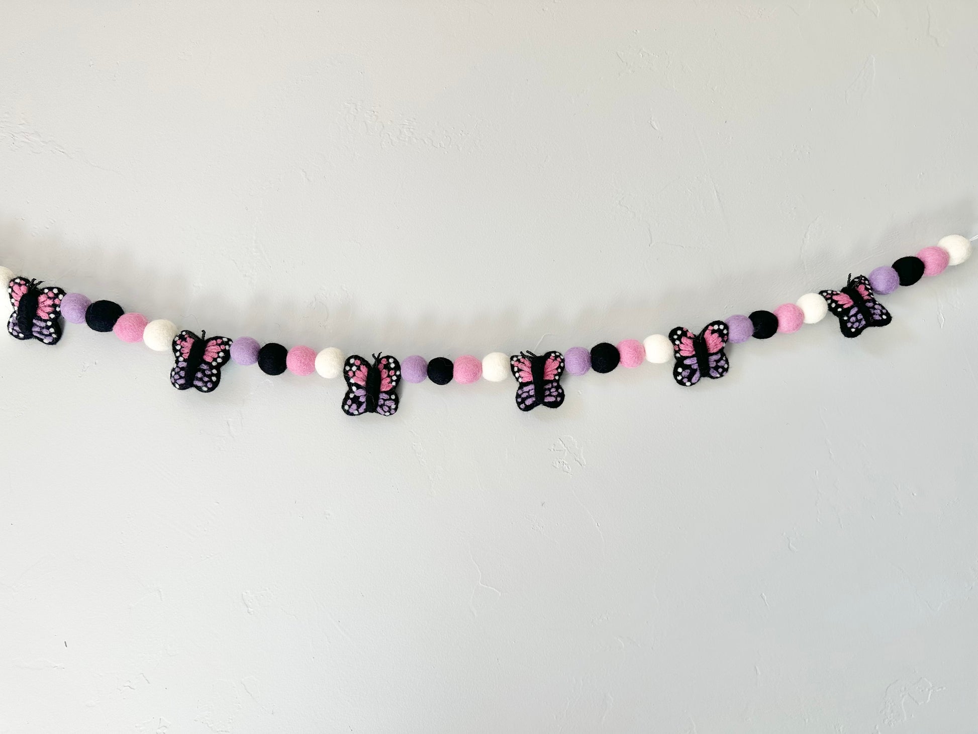 Wool Jamboree pink/purple butterfly garland is bright and perfect for a birthday party or kid's bedroom wall decor! You can hang it on your mantel, wall, window, or photo backdrop.