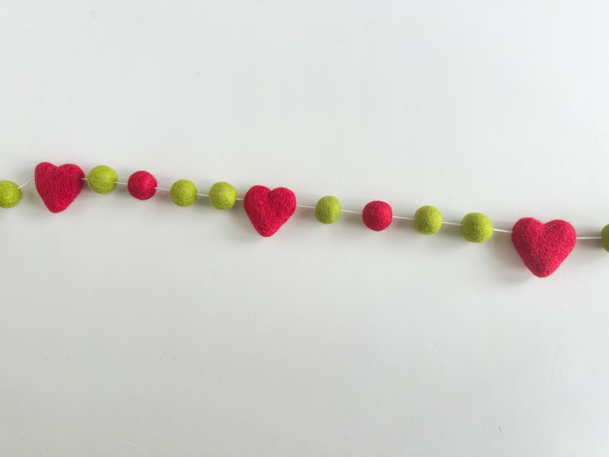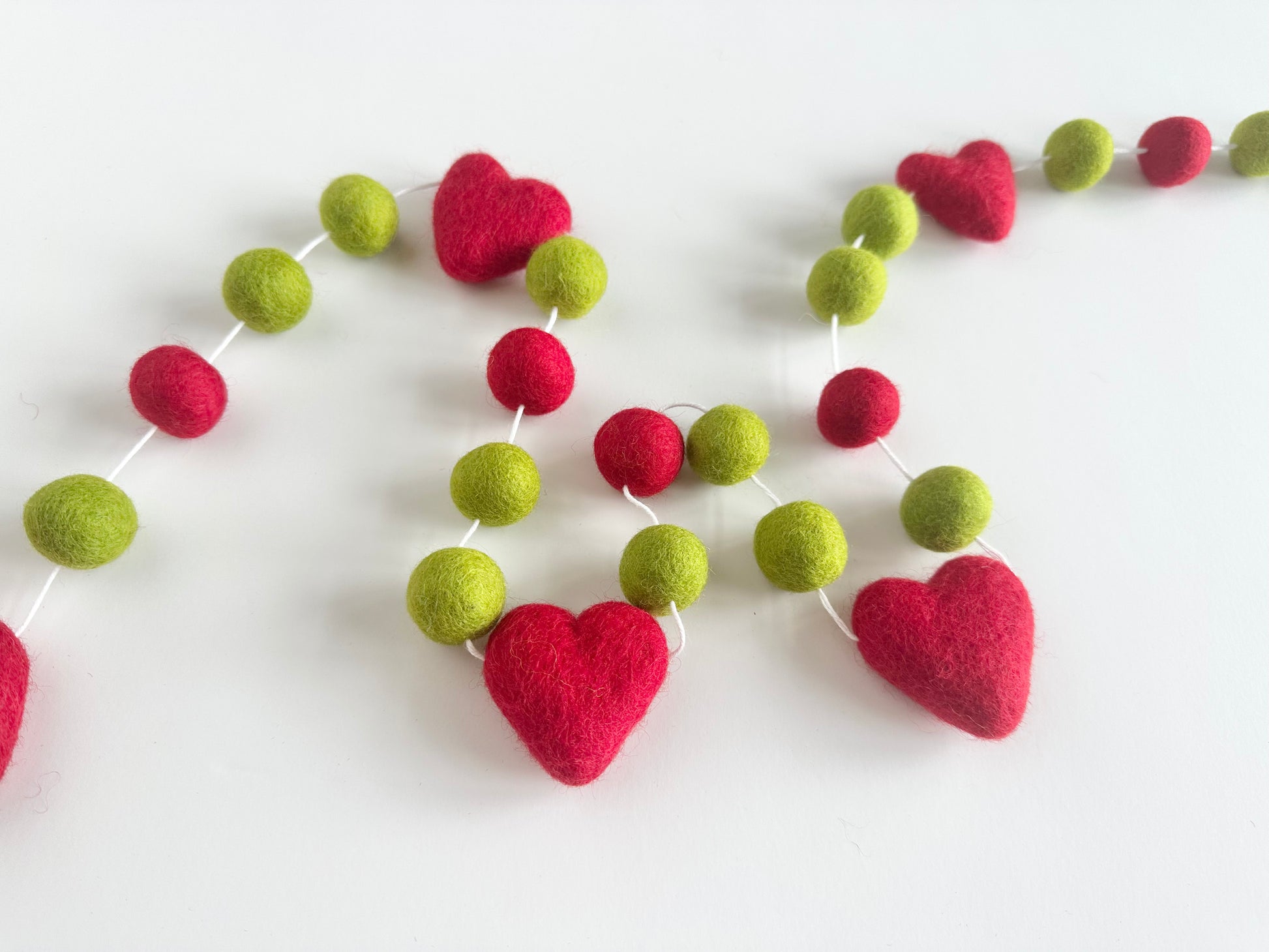 Wool Jamboree red heart and Grinchy green felt ball garland is bright and perfect for holiday home decor and Christmas wall decorations. Can be hung on the wall, window, flowing over a table top or even around a class doorway!
