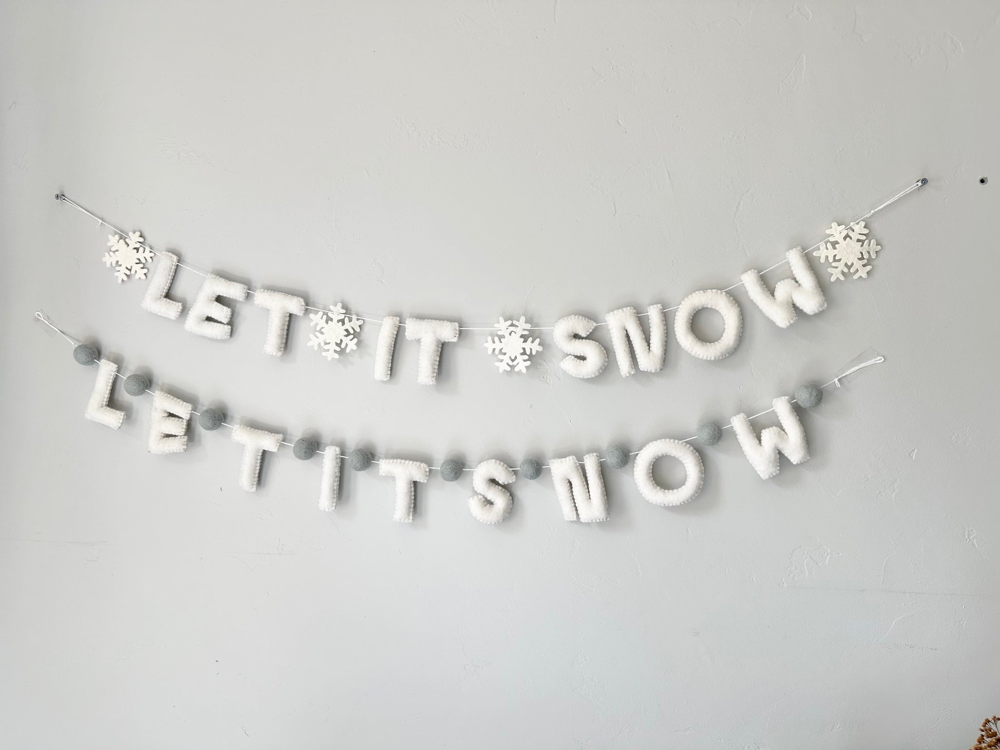 Made of 9 white felt letters spelling out "LET IT SNOW". The letters are 3 inches tall and vary in width. There are three options to choose from: