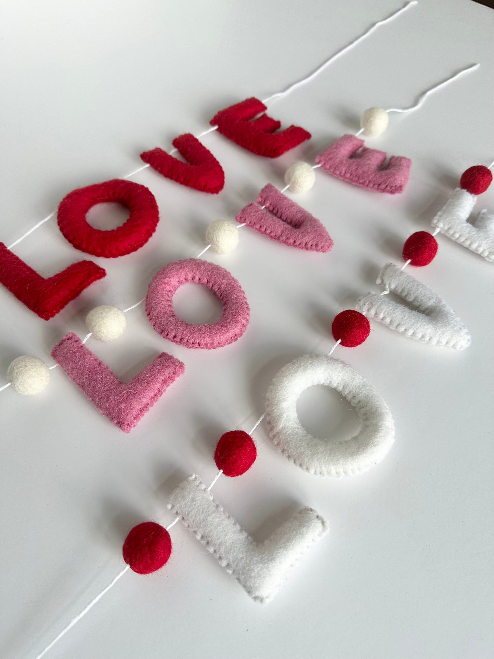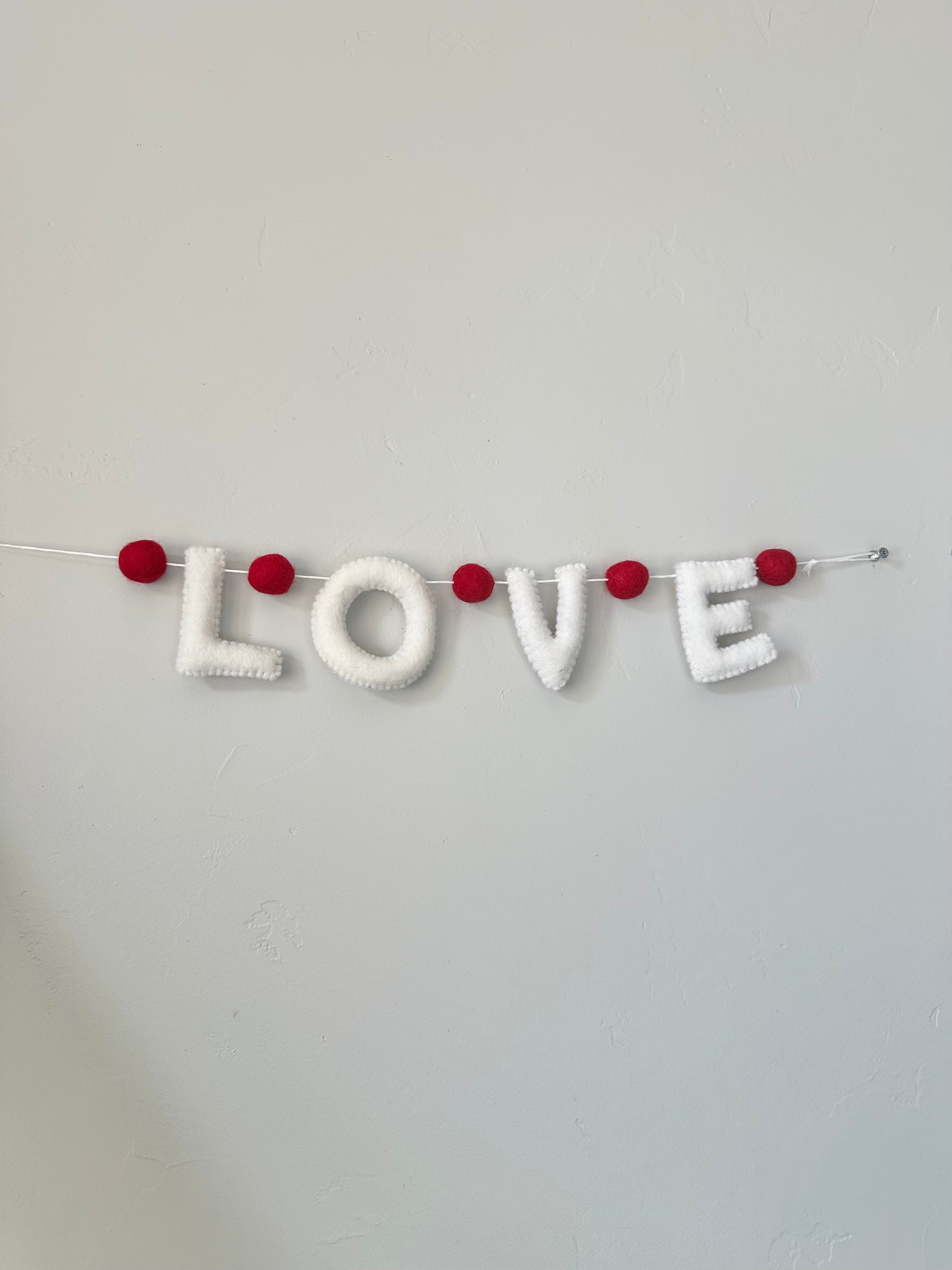 Wool Jamboree LOVE banner is perfect for reusable Valentine's Day celebrations or all season decor! You can hang it on your mantel, wall, window, or in a photo op backdrop! ATTENTION: If ordering more than one of this listing, contact me first to verify inventory/turn around time, thanks Amy - info@wooljamboree.com