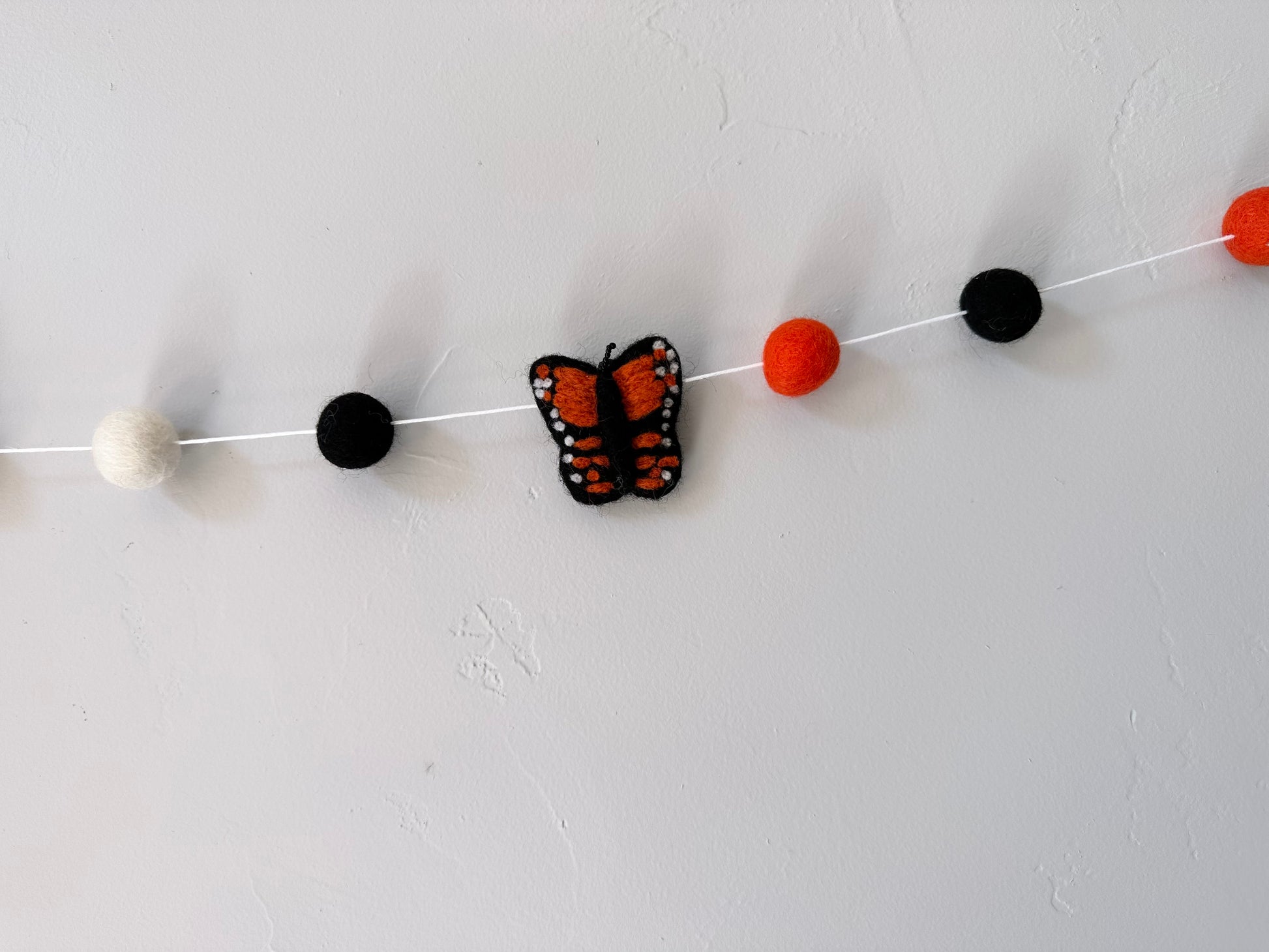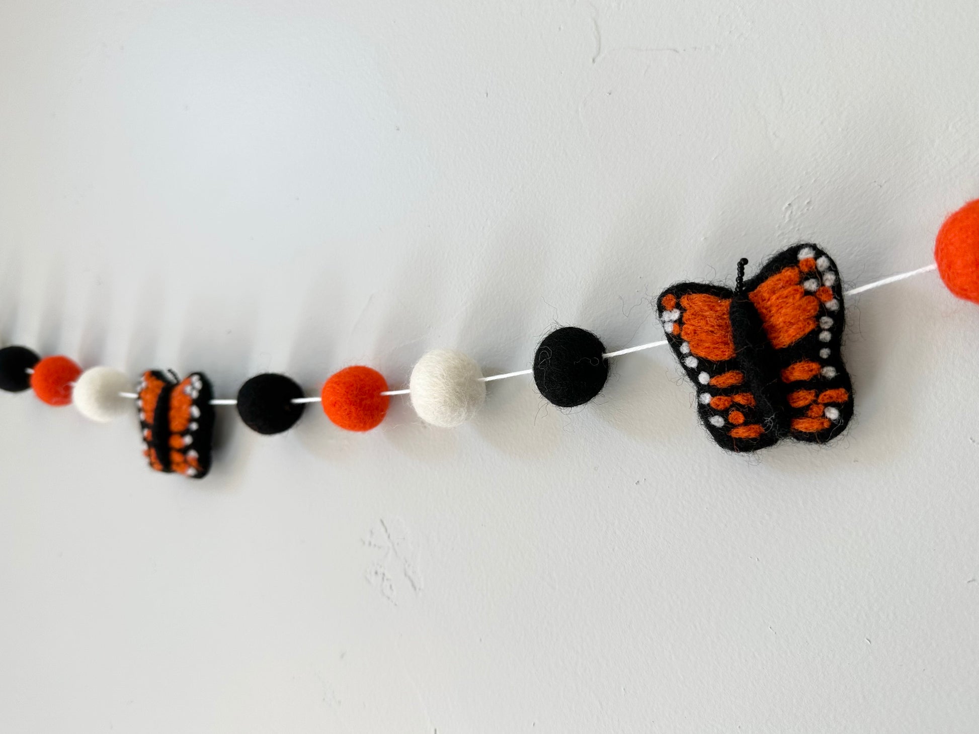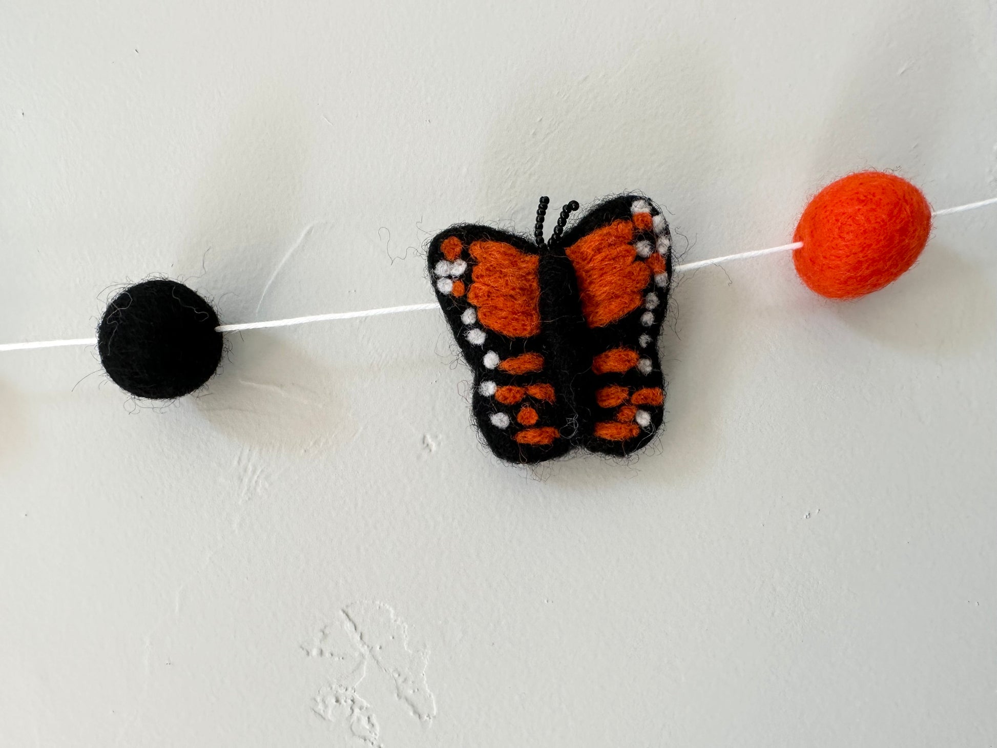 Wool Jamboree monarch butterfly garland is bright and perfect for seasonal mantel decor, a birthday party, or kid's bedroom wall decor! You can hang it on your mantel, wall, window, or photo backdrop.