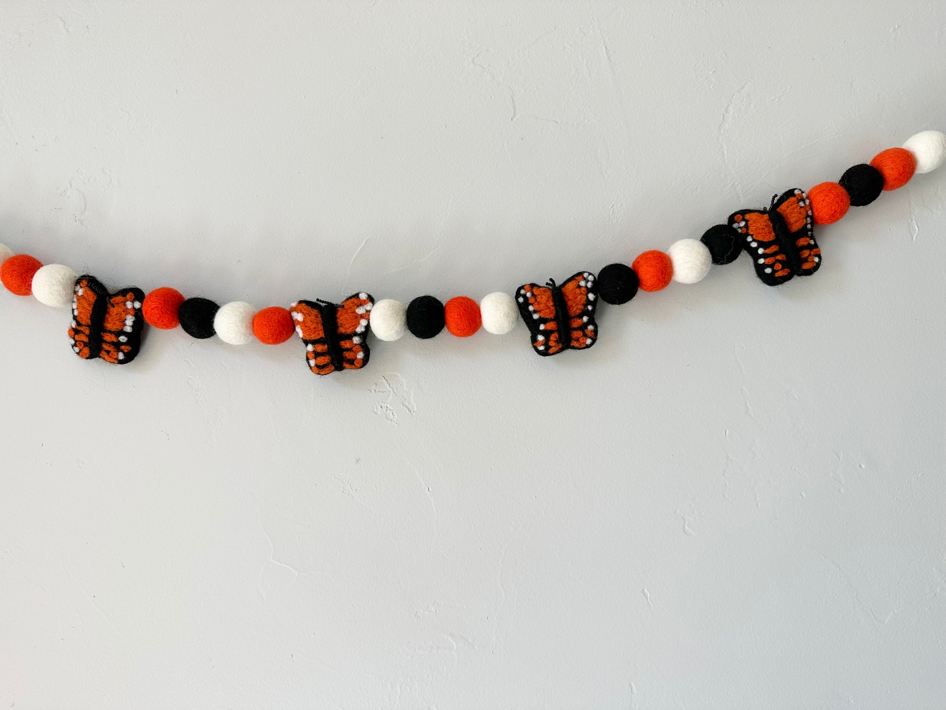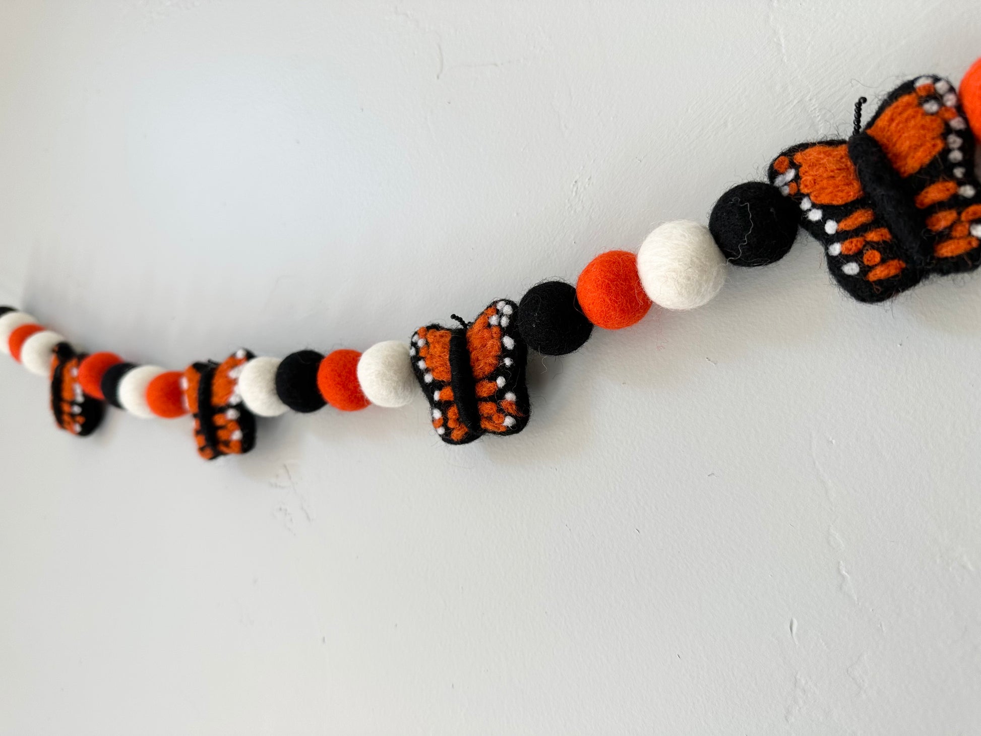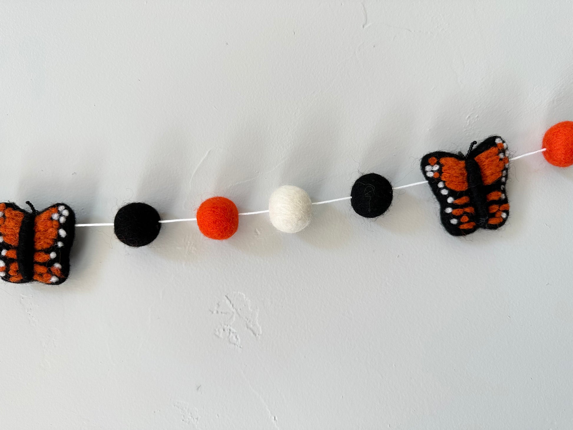 Wool Jamboree monarch butterfly garland is bright and perfect for seasonal mantel decor, a birthday party, or kid's bedroom wall decor! You can hang it on your mantel, wall, window, or photo backdrop.