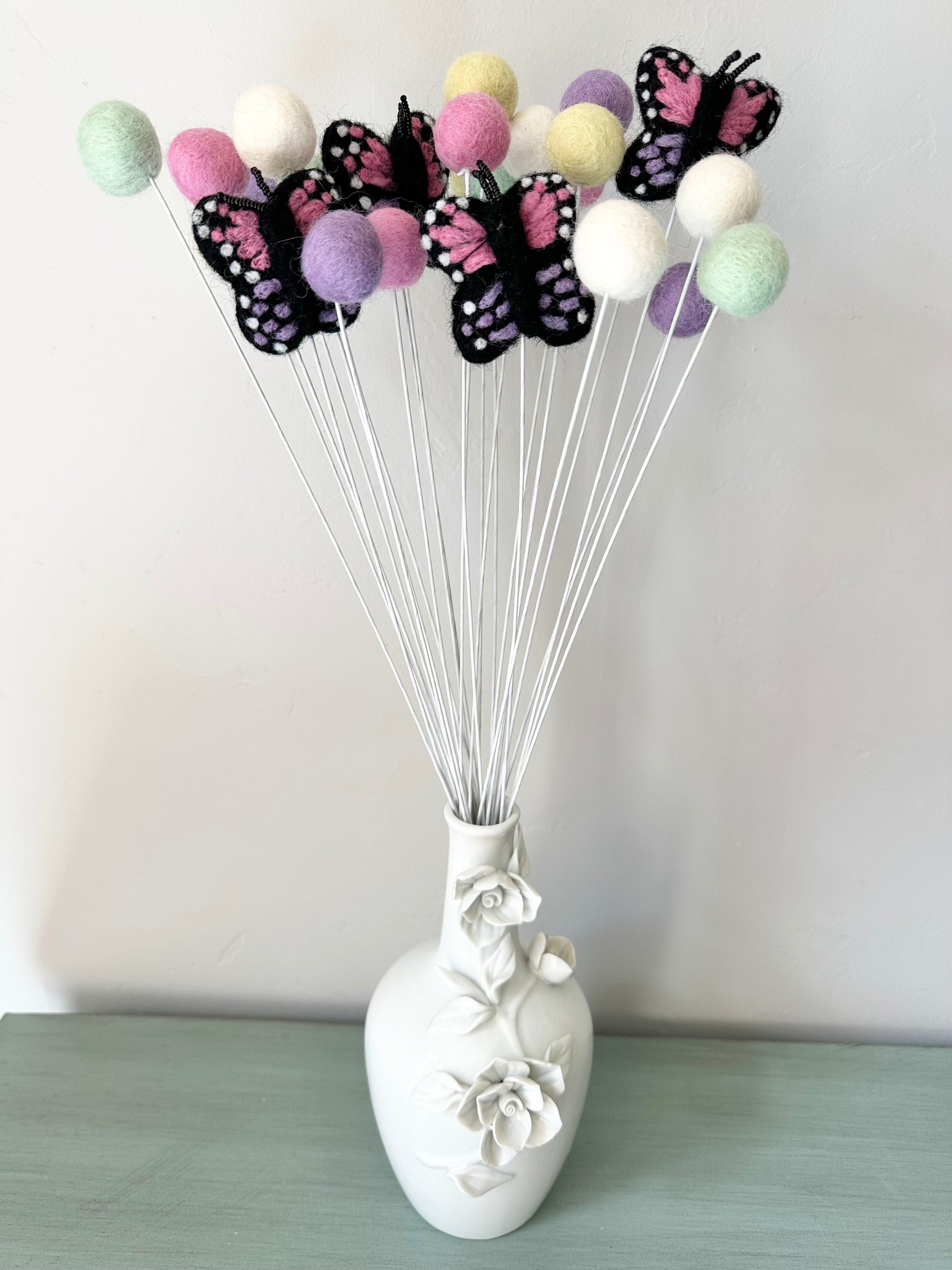 10 stems: 2 butterflies and 8 felt balls