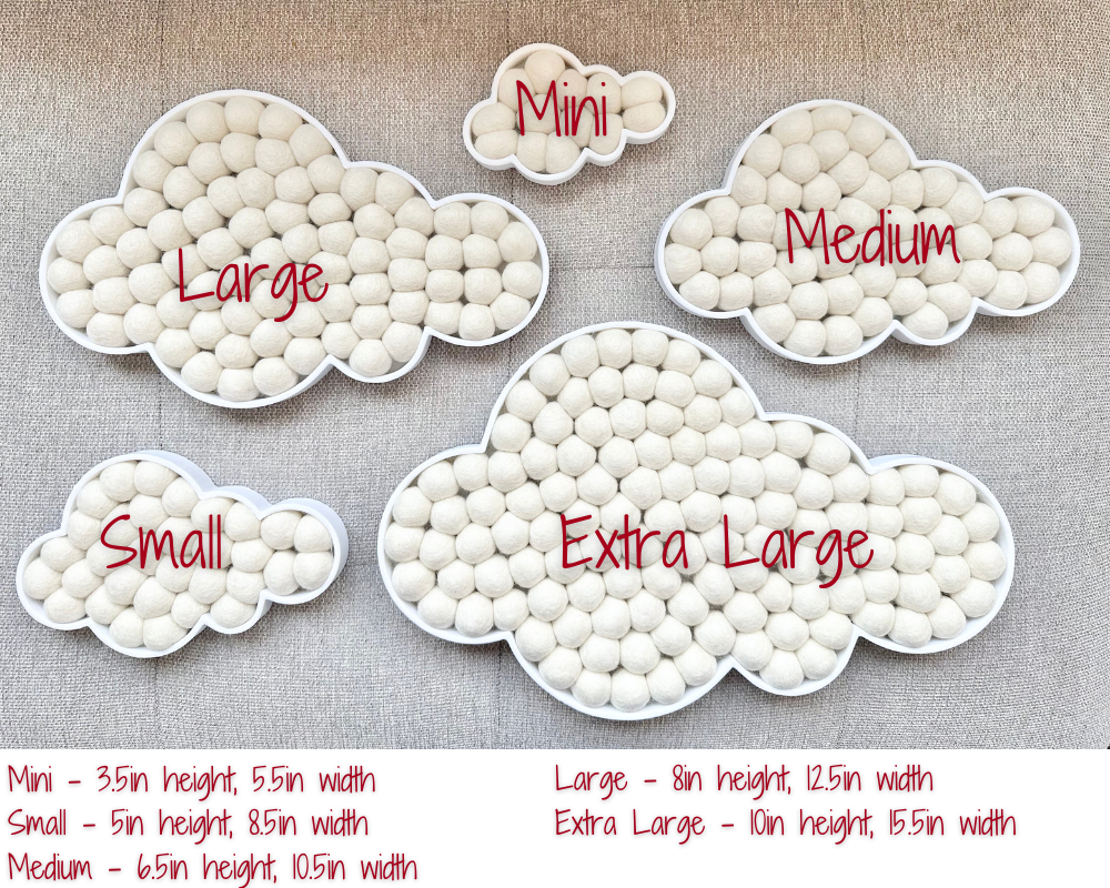 The cloud is made by 3d printing with PLA Plastic. There are two holes in the back for level hanging on the wall. Felt balls are 100% wool and measure 2.5 cm each. Five sizes to choose from: