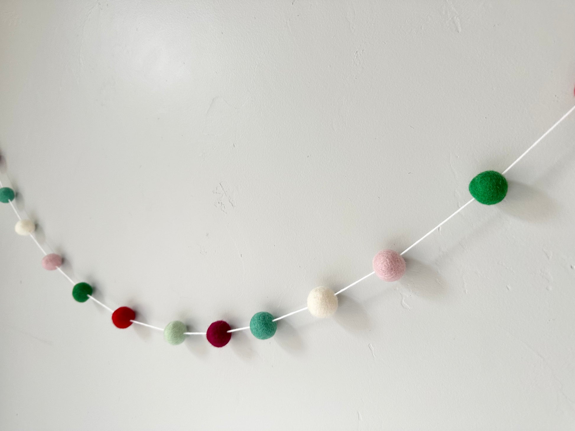 Christmas felt ball garland is bright and perfect for nurseries, holiday decorations, fireplace decor or party decorations! You can hang it on your mantel, wall, window, doorway, or flowing throughout your tiered tray or letterboard!