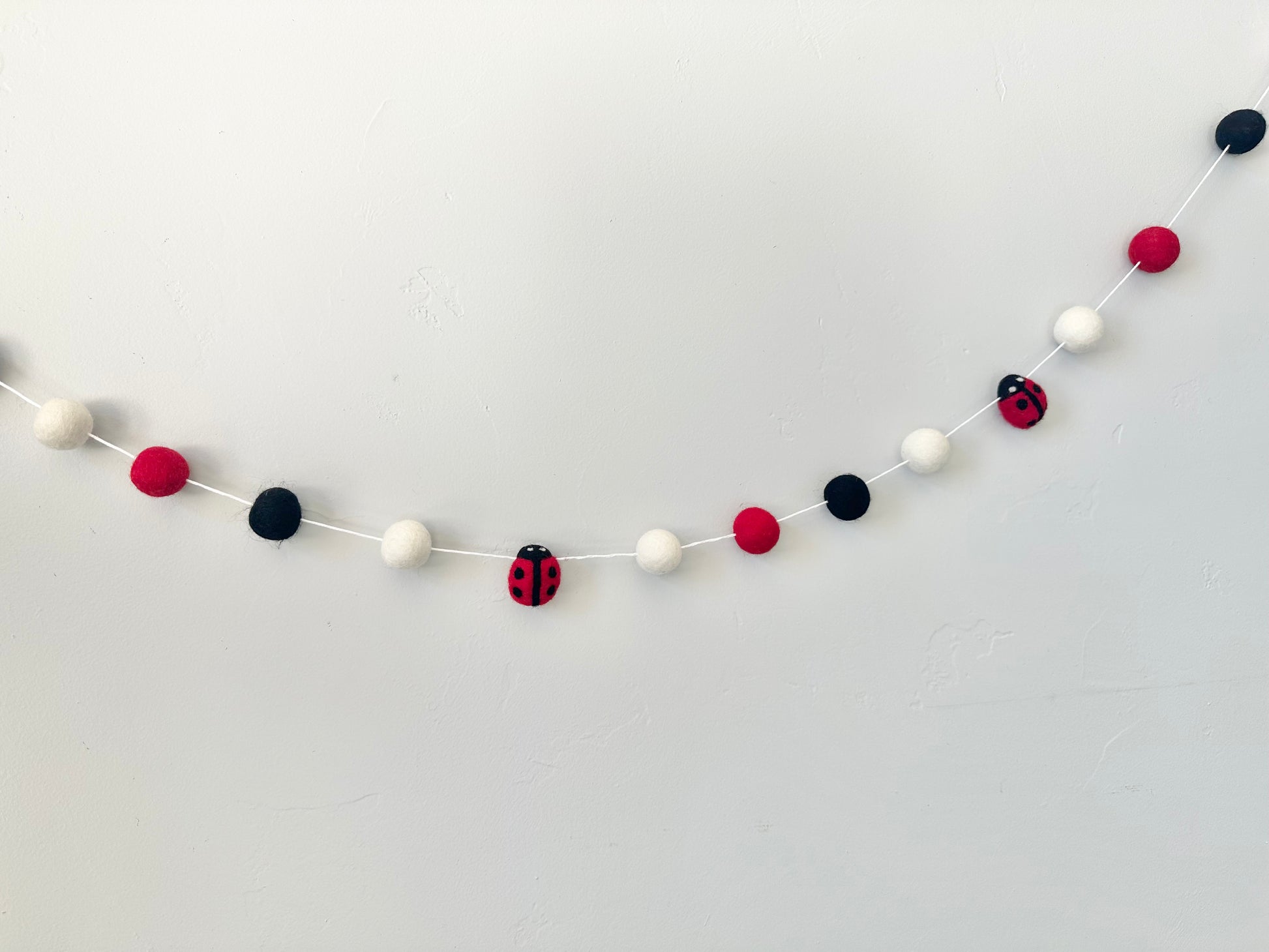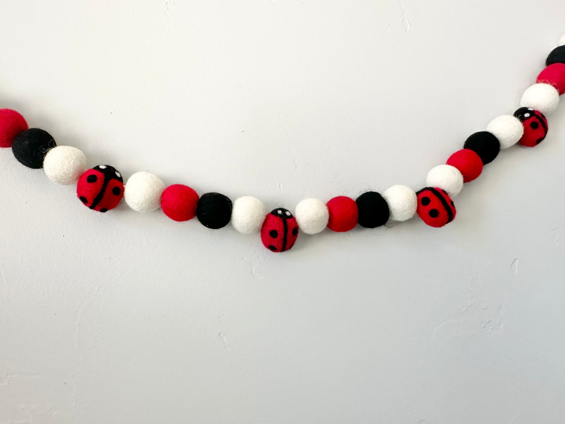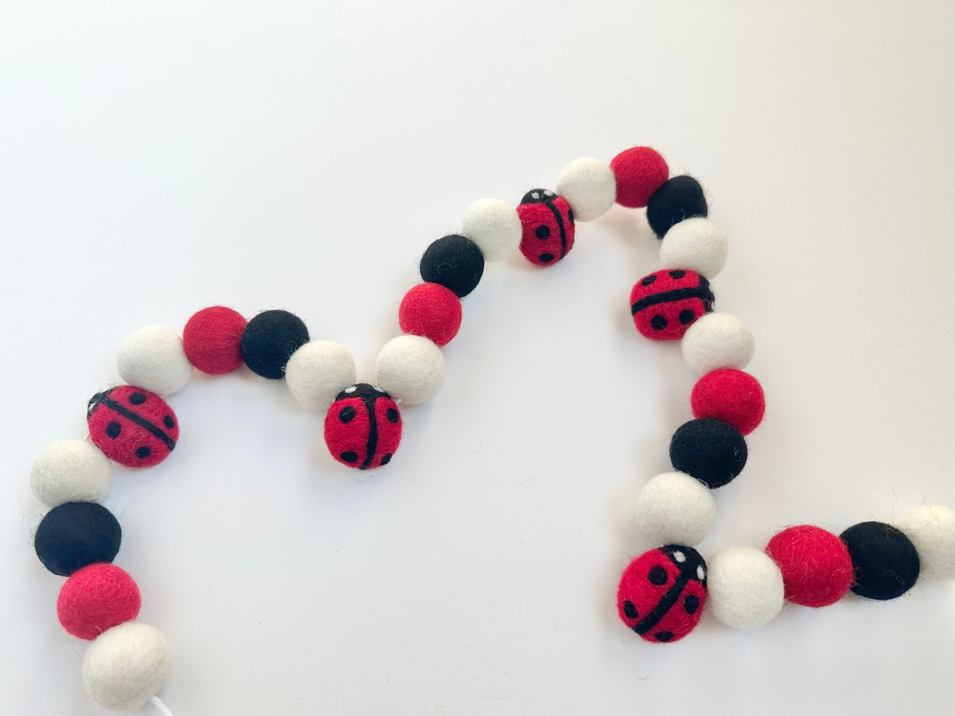Wool Jamboree felt ball and lady bug garland is bright and perfect for summer decorations, fireplace decor or birthday celebrations! You can hang it on your mantel, wall, window, or around a tiered tray!