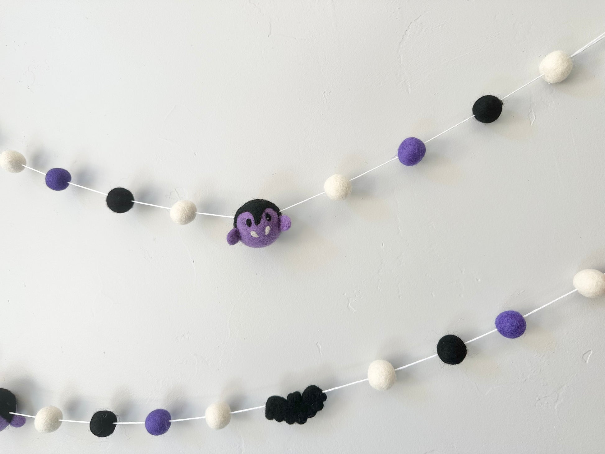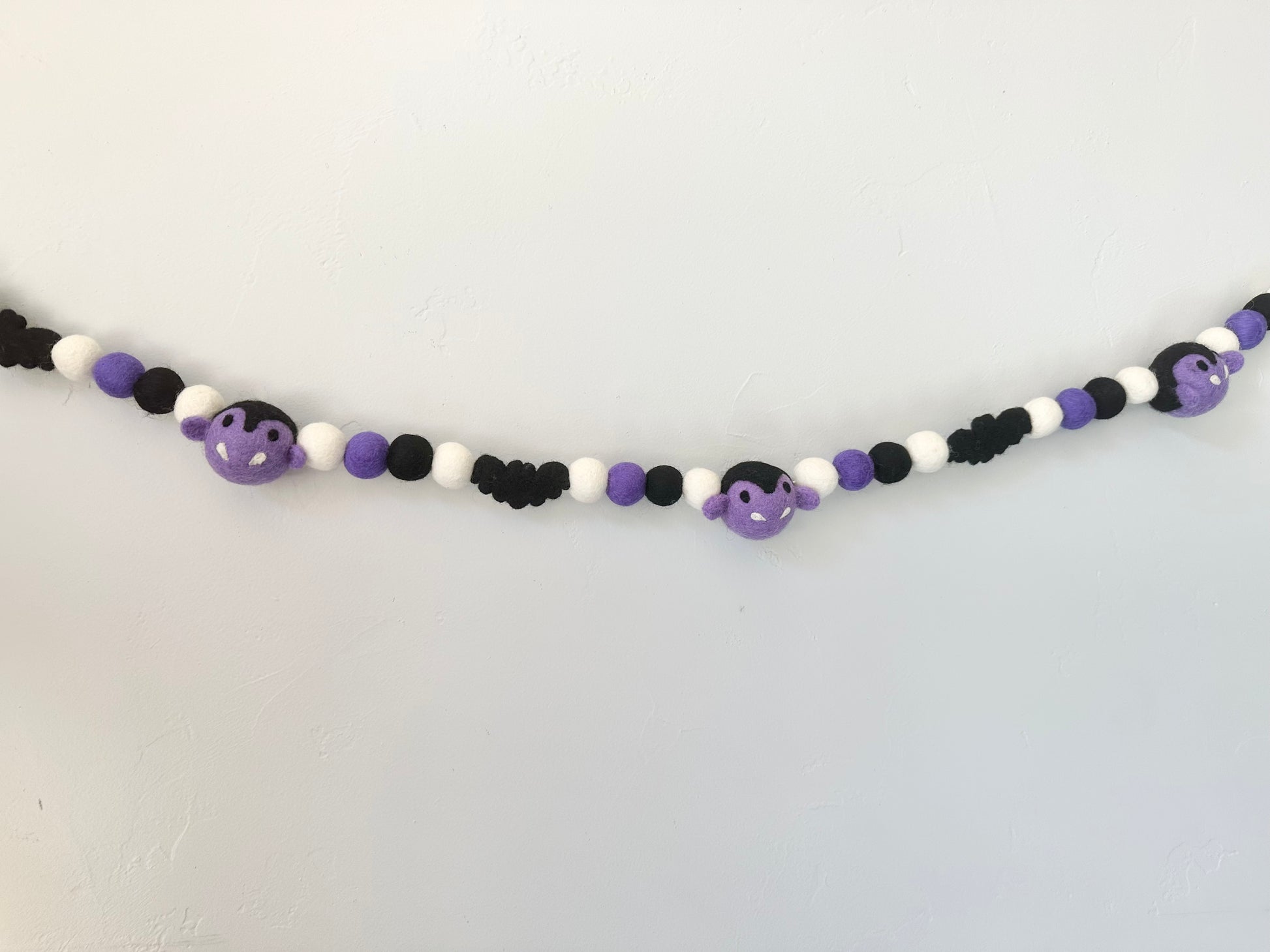 Wool Jamboree flying bat and vampire garland is perfect for October mantel decor, spooky Halloween decorations for your haunted house, or fun fall birthday celebrations! You can hang it on your mantel, wall, window, or photo backdrop.