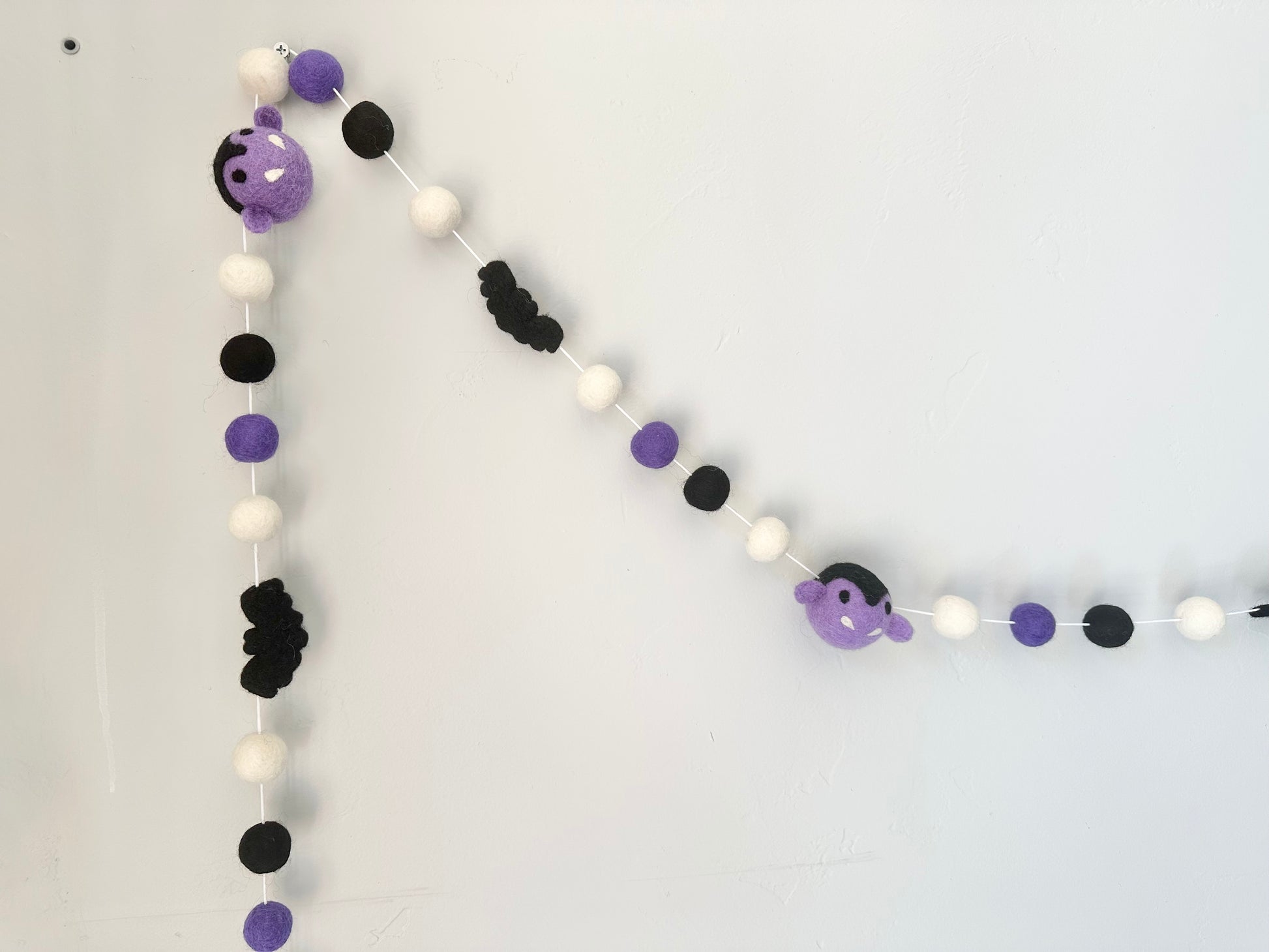 Made of 2.5 cm felt wool balls with solid wool vampire heads and flying bats alternating, strung on white cotton cord (or your choice of colored Bakers Twine if you add that FREE listing to your cart as well). Do not pick bakers twine for touching garlands, it is not seen. Shapes (meaning bats, vampires AND balls) on the garland are not knot tied, and can be slid around to get the look you desire. They will stay where you want them.
