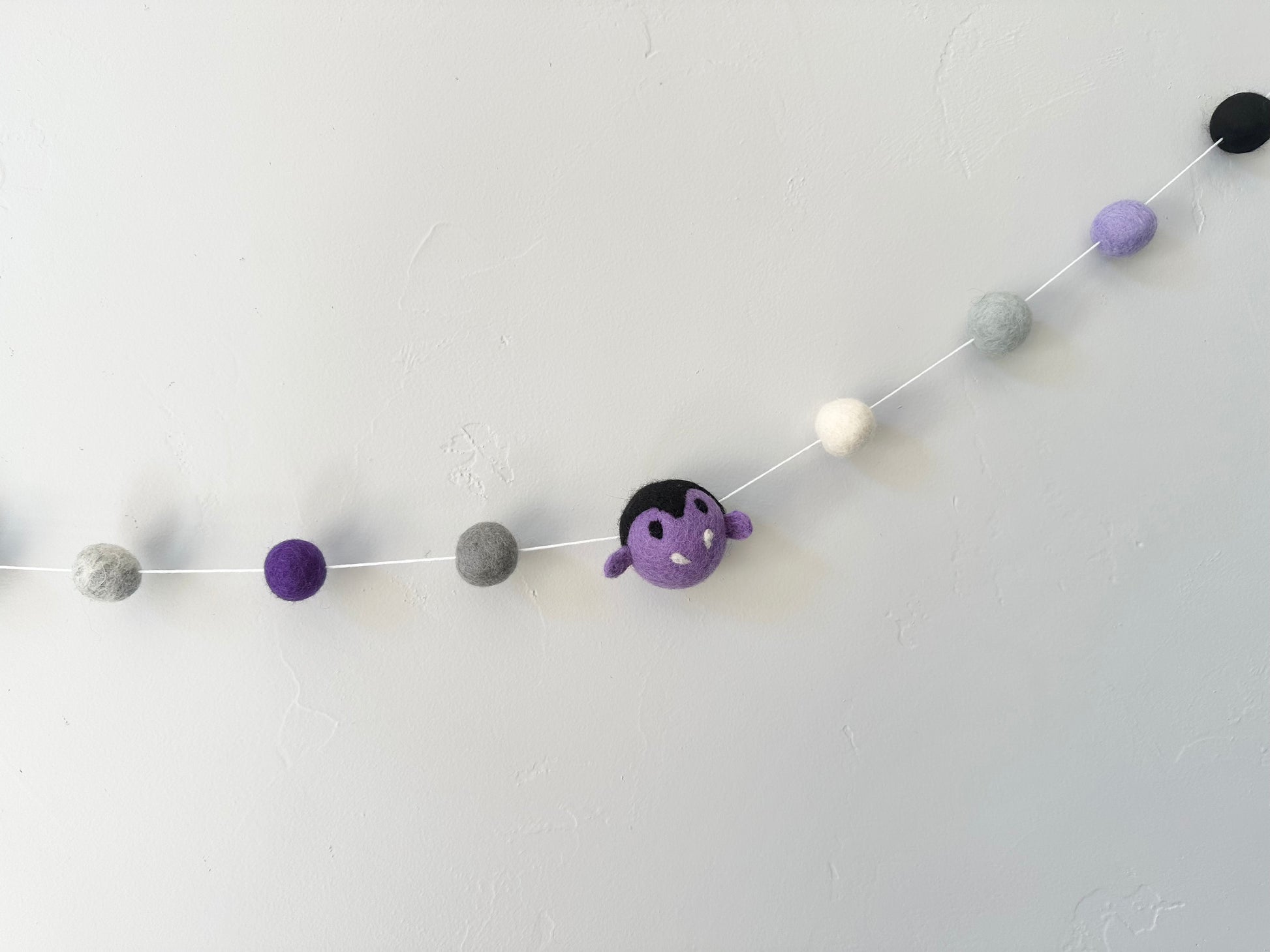 Made of 2.5 cm felt wool balls with solid wool vampire heads, strung on white cotton cord (or your choice of colored Bakers Twine if you add that FREE listing to your cart as well). Do not pick bakers twine for touching garlands, it is not seen. Shapes (meaning vampires AND balls) on the garland are not knot tied, and can be slid around to get the look you desire. They will stay where you want them.