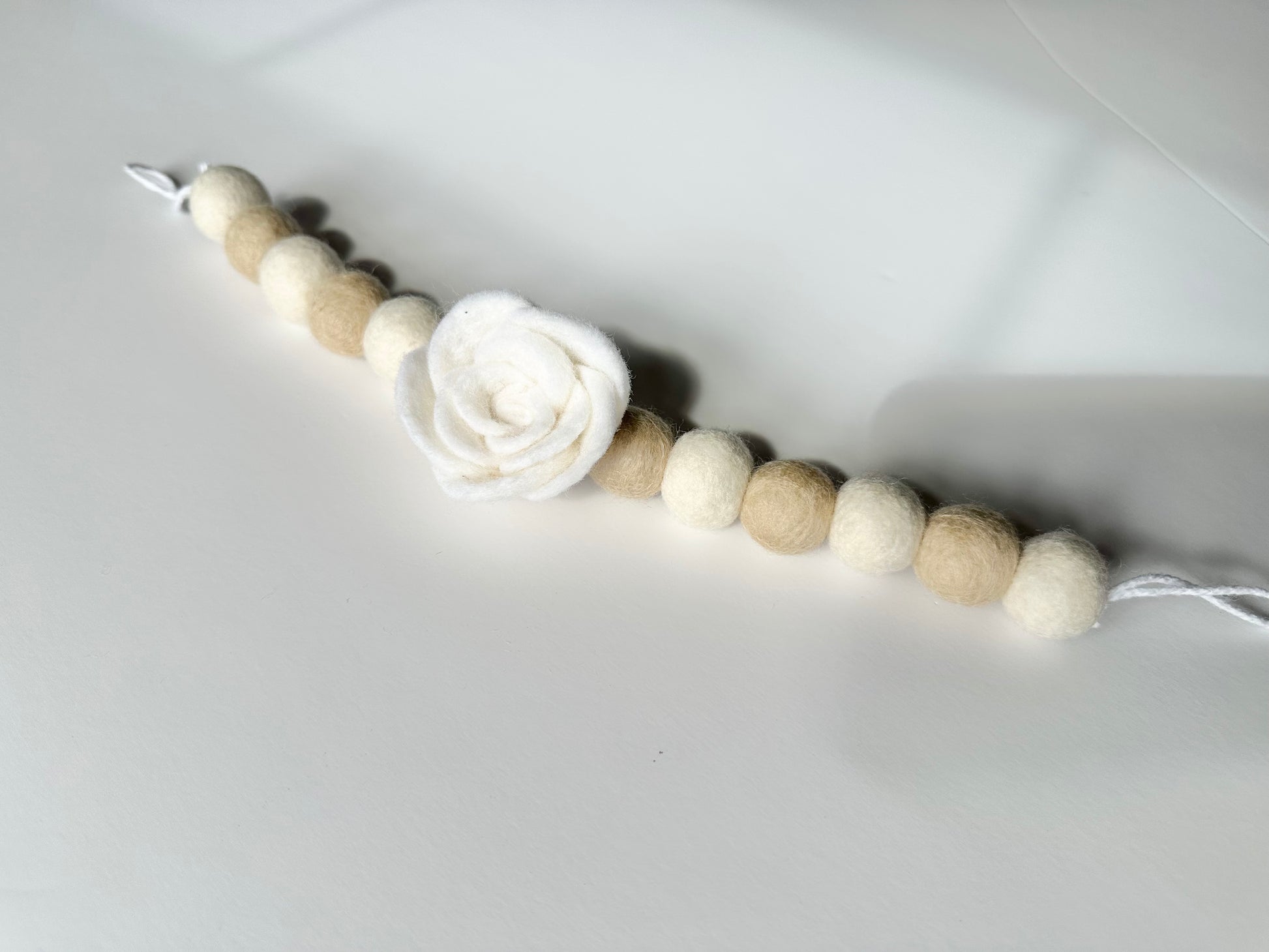 Dress up your curtains in your own perfect color scheme with these white rose and felt ball curtain tie backs! This listing is for either a single curtain tie or a set of 2 matching tie backs. Made with 2.5cm felt balls, a 3D felted white rose, and cotton cord.
