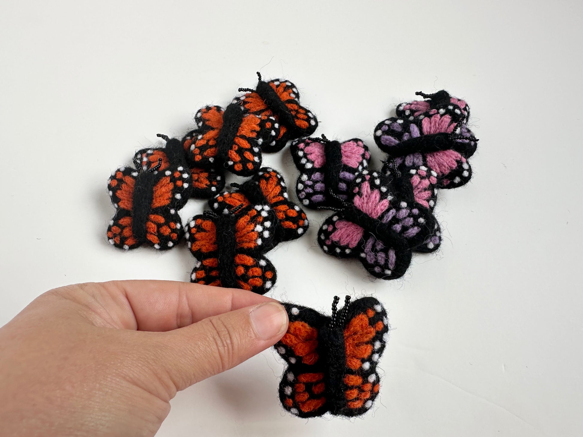 These wool monarch butterflies are dark orange, black and white. The girly butterflies are lilac, pink, black and white. They measure 2.25 inches by 2.25 inches and a 1 inch depth. EXACT SIZE MAY VARY due to their handmade nature.
